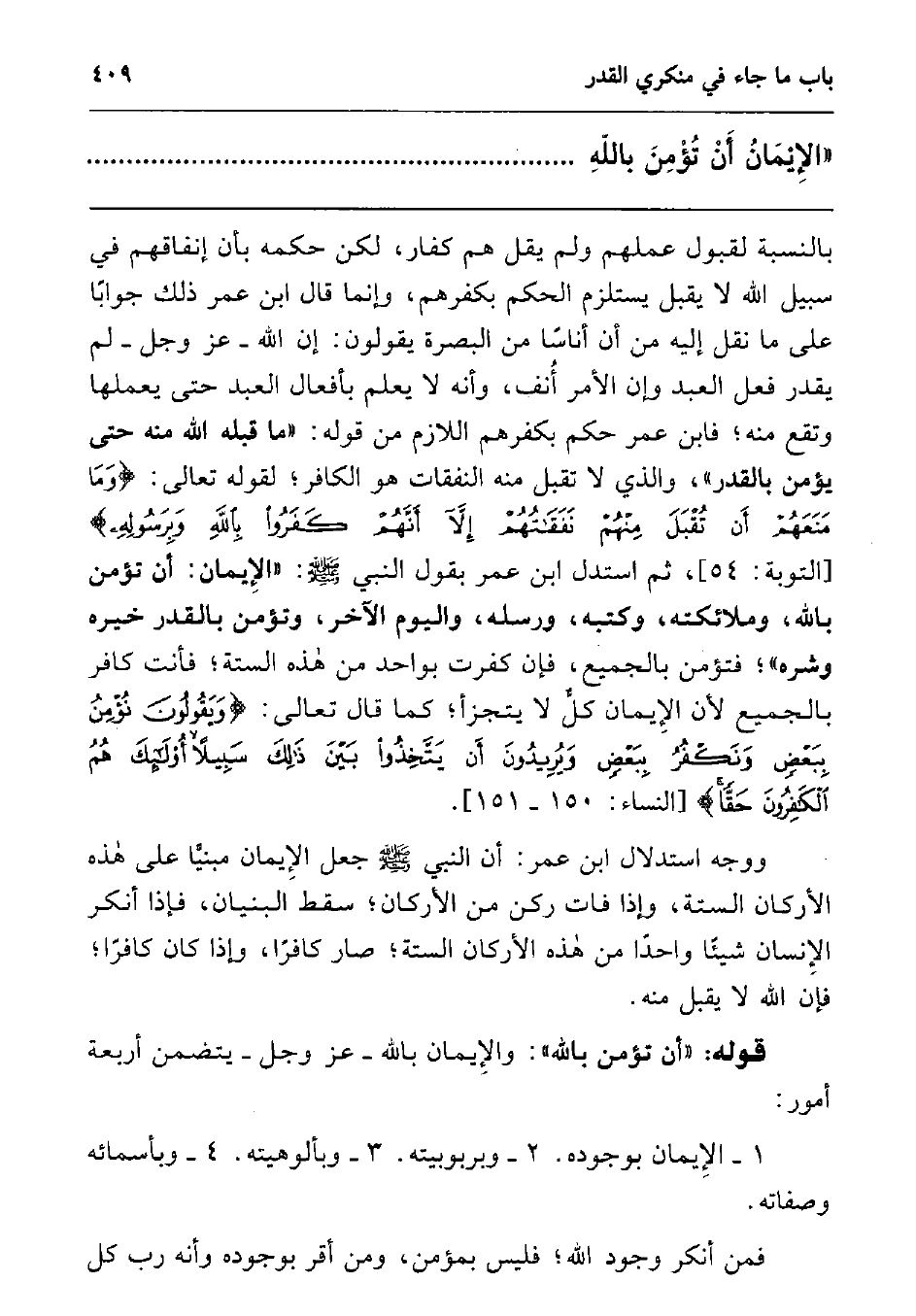بالنسبة لقبول عملهم، ولم يقل هم كفار، لكن حكمه بأن إنفاقهم في سبيل الله لا يقبل يستلزم الحكم بكفرهم، وإنما قال ابن عمر ذلك جوابا على ما نقل إليه من أن أناسا من البصرة يقولون: إن الله عز وجل لم يقدر فعل العبد، وإن الأمر أنف، وأنه لا يعلم بأفعال العبد حتى يعملها وتقع منه; فابن عمر حكم بكفرهم اللازم من قوله: "ما قبله الله منه حتى يؤمن بالقدر"، والذي لا تقبل منه النفقات هو الكافر; لقوله تعالى: {وَمَا مَنَعَهُمْ أَنْ تُقْبَلَ مِنْهُمْ نَفَقَاتُهُمْ إِلاَّ أَنَّهُمْ كَفَرُوا بِاللَّهِ وَبِرَسُولِهِ} 1 ثم استدل ابن عمر بقول النبي صلى الله عليه وسلم "الإيمان: أن تؤمن بالله، وملائكته، وكتبه، ورسله، واليوم الآخر، وتؤمن بالقدر خيره وشره "2 فتؤمن بالجميع، فإن كفرت بواحد من هذه الستة; فأنت كافر بالجميع لأن الإيمان كل لا يتجزأ; كما قال تعالى: {وَيَقُولُونَ نُؤْمِنُ بِبَعْضٍ وَنَكْفُرُ بِبَعْضٍ وَيُرِيدُونَ أَنْ يَتَّخِذُوا بَيْنَ ذَلِكَ سَبِيلاً أُولَئِكَ هُمُ الْكَافِرُونَ حَقّاً} 3.