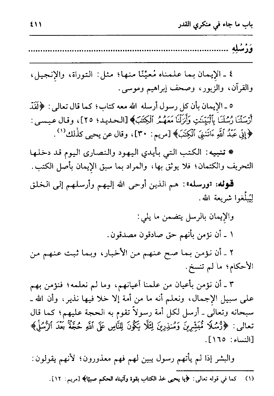 5- الإيمان بأن كل رسول أرسله الله معه كتاب; كما قال تعالى: {لَقَدْ أَرْسَلْنَا رُسُلَنَا بِالْبَيِّنَاتِ وَأَنْزَلْنَا مَعَهُمُ الْكِتَابَ} 1 وقال عيسى: {إِنِّي عَبْدُ اللَّهِ آتَانِيَ الْكِتَابَ} 2 وقال عن يحيى كذلك3.