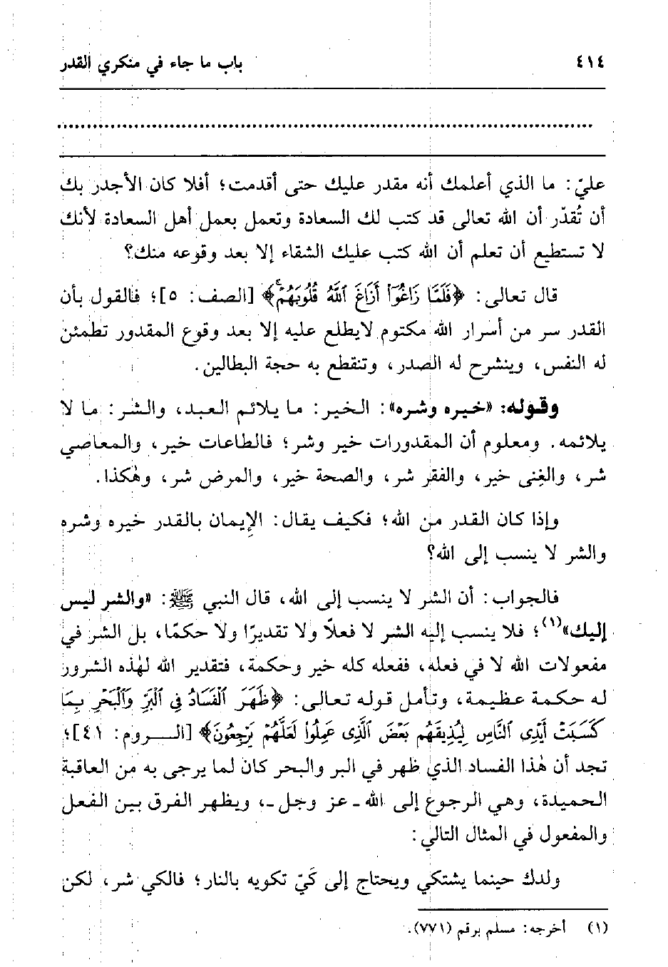 علي: ما الذي أعلمك أنه مقدر عليك حتى أقدمت; أفلا كان الأجدر بك أن تقدر أن الله تعالى قد كتب لك السعادة وتعمل بعمل أهل السعادة لأنك لا تستطيع أن تعلم أن الله كتب عليك الشقاء إلا بعد وقوعه منك؟
