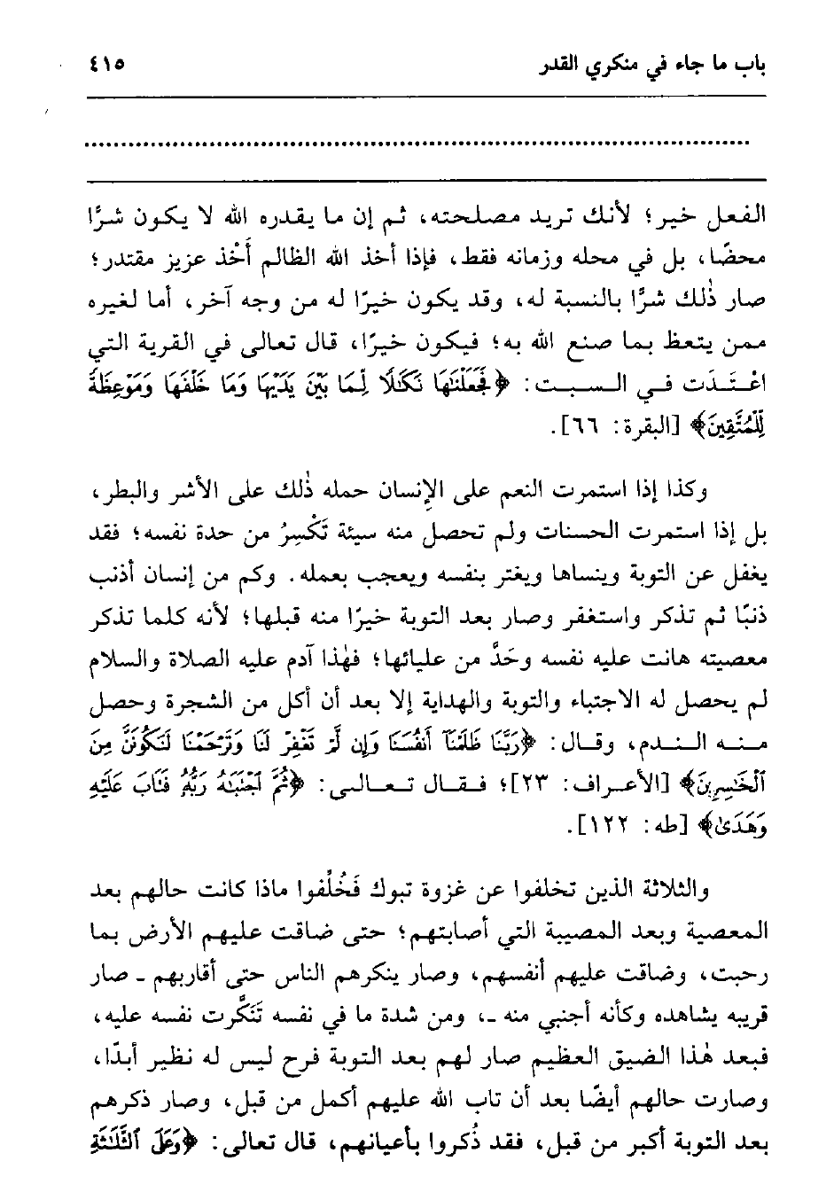 وكذا إذا استمرت النعم على الإنسان حمله ذلك على الأشر والبطر، بل إذا استمرت الحسنات ولم تحصل منه سيئة تكسر من حدة نفسه; فقد يغفل عن التوبة وينساها ويغتر بنفسه ويعجب بعمله. وكم من إنسان أذنب ذنبا ثم تذكر واستغفر وصار بعد التوبة خيرا منه قبلها; لأنه كلما تذكر معصيته هانت عليه نفسه وحد من عليائها; فهذا آدم عليه الصلاة والسلام لم يحصل له الاجتباء والتوبة والهداية إلا بعد أن أكل من الشجرة وحصل منه الندم، وقال: {رَبَّنَا ظَلَمْنَا أَنْفُسَنَا وَإِنْ لَمْ تَغْفِرْ لَنَا وَتَرْحَمْنَا لَنَكُونَنَّ مِنَ الْخَاسِرِينَ} 2 فقال تعالى: {ثُمَّ اجْتَبَاهُ رَبُّهُ فَتَابَ عَلَيْهِ وَهَدَى} 3.