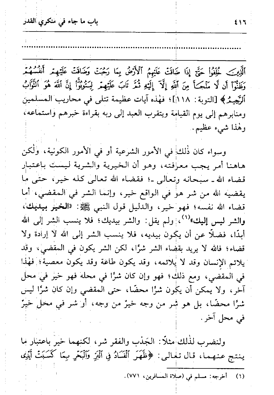 وسواء كان ذلك في الأمور الشرعية أو في الأمور الكونية، ولكن هاهنا أمر يجب معرفته، وهو أن الخيرية والشرية ليست باعتبار قضاء الله -سبحانه وتعالى-; فقضاء الله تعالى كله خير، حتى ما يقضيه الله من شر هو في الواقع خير، وإنما الشر في المقضي، أما قضاء الله نفسه; فهو خير، والدليل قول النبي صلى الله عليه وسلم " الخير بيديك، والشر ليس إليك "2 ولم يقل: والشر بيديك; فلا ينسب الشر إلى الله أبدا، فضلا عن أن يكون بيديه، فلا ينسب الشر إلى الله لا إرادة ولا قضاء; فالله لا يريد بقضاء الشر شرا، لكن الشر يكون في المقضي، وقد يلائم الإنسان وقد لا يلائمه، وقد يكون طاعة وقد يكون معصية; فهذا في المقضي، ومع ذلك; فهو وإن كان شرا في محله فهو خير في محل آخر، ولا يمكن أن يكون شرا محضا، حتى المقضي وإن كان شرا ليس شرا محضا، بل هو شر من وجه خير من وجه، أو شر في محل خير في محل آخر.