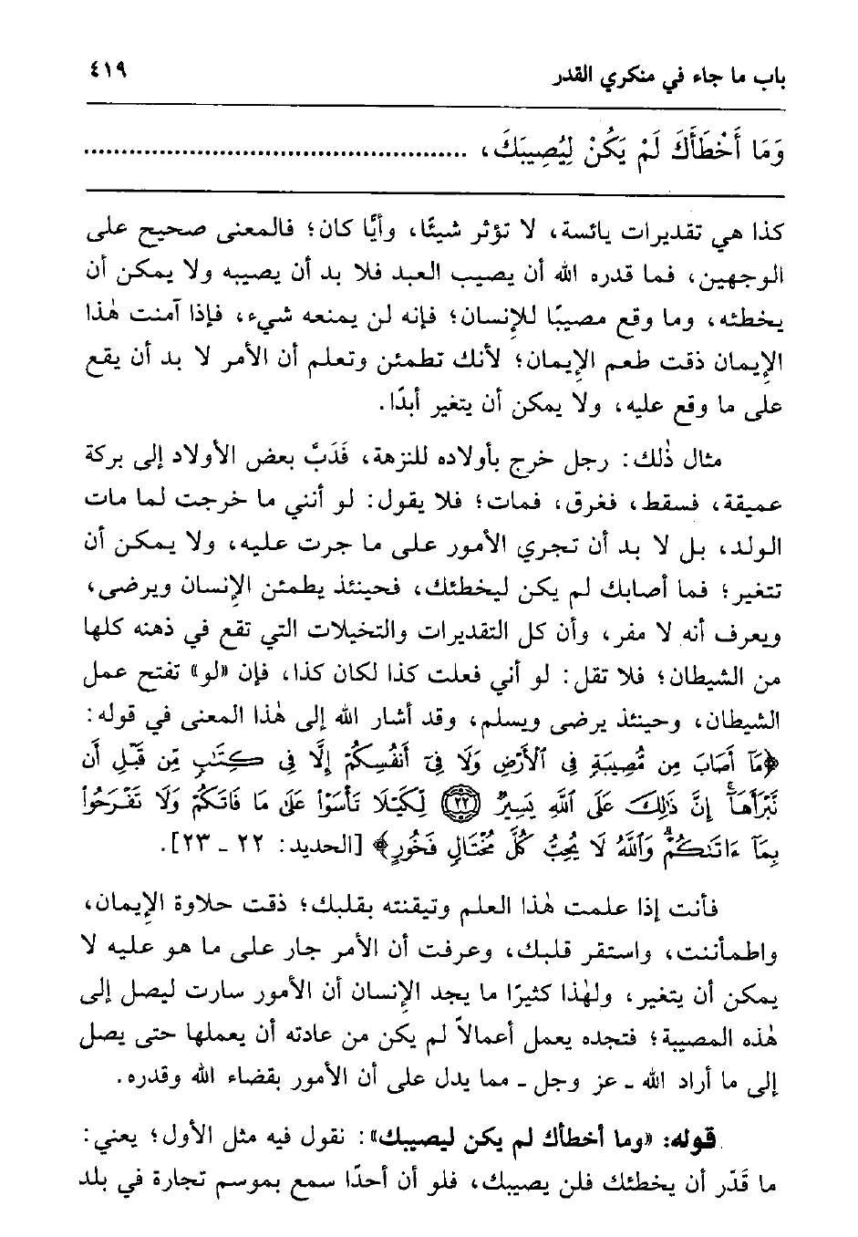 كذا هي تقديرات يائسة، لا تؤثر شيئا، وأيا كان; فالمعنى صحيح على الوجهين، فما قدره الله أن يصيب العبد فلا بد أن يصيبه ولا يمكن أن يخطئه، وما وقع مصيبا للإنسان; فإنه لن يمنعه شيء، فإذا آمنت هذا الإيمان ذقت طعم الإيمان; لأنك تطمئن وتعلم أن الأمر لا بد أن يقع على ما وقع عليه، ولا يمكن أن يتغير أبدا.
