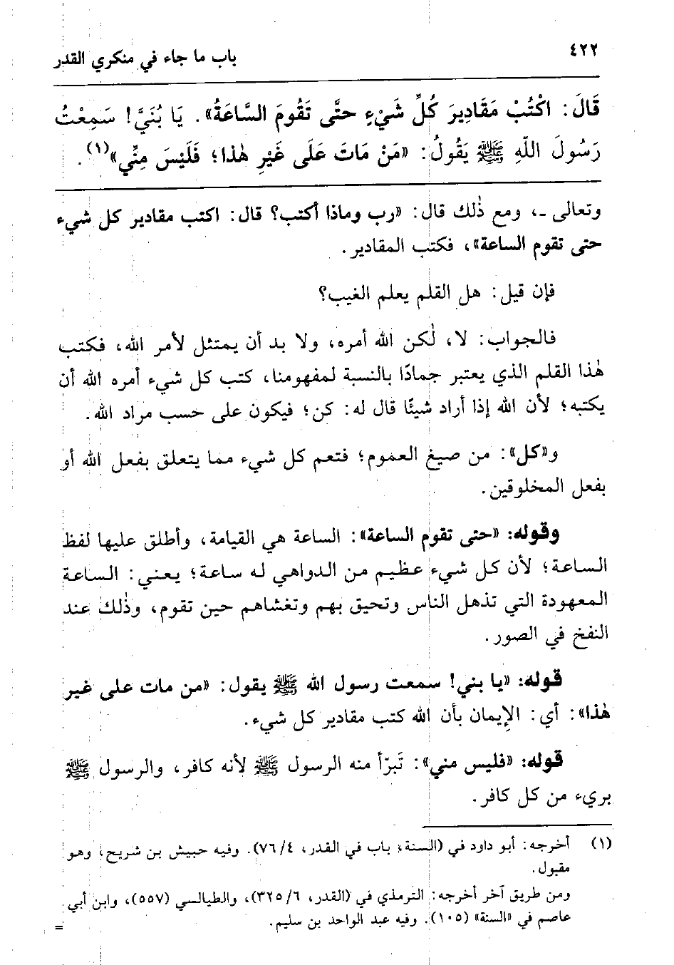 قال: اكتب مقادير كل شيء حتى تقوم الساعة "1. يا بني سمعت رسول الله صلى الله عليه وسلم يقول: "من مات على غير هذا فليس مني "2.