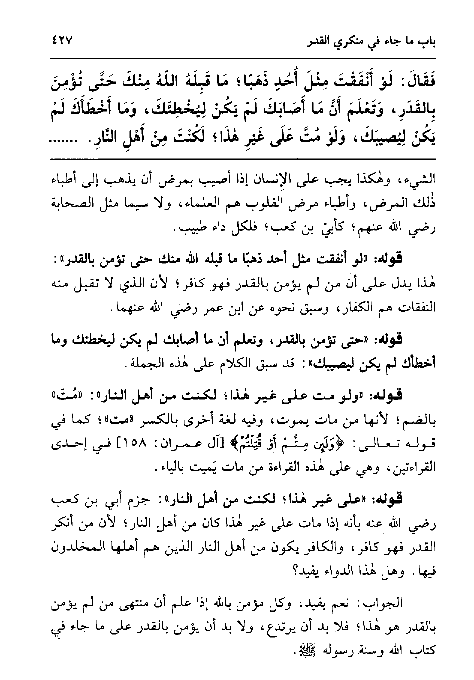 فقال: لو أنفقت مثل أحد ذهبا; ما قبله الله منك حتى تؤمن بالقدر، وتعلم أن ما أصابك لم يكن ليخطئك، وما أخطأك لم يكن ليصيبك، ولو مت على غير هذا; لكنت من أهل النار..........................................
