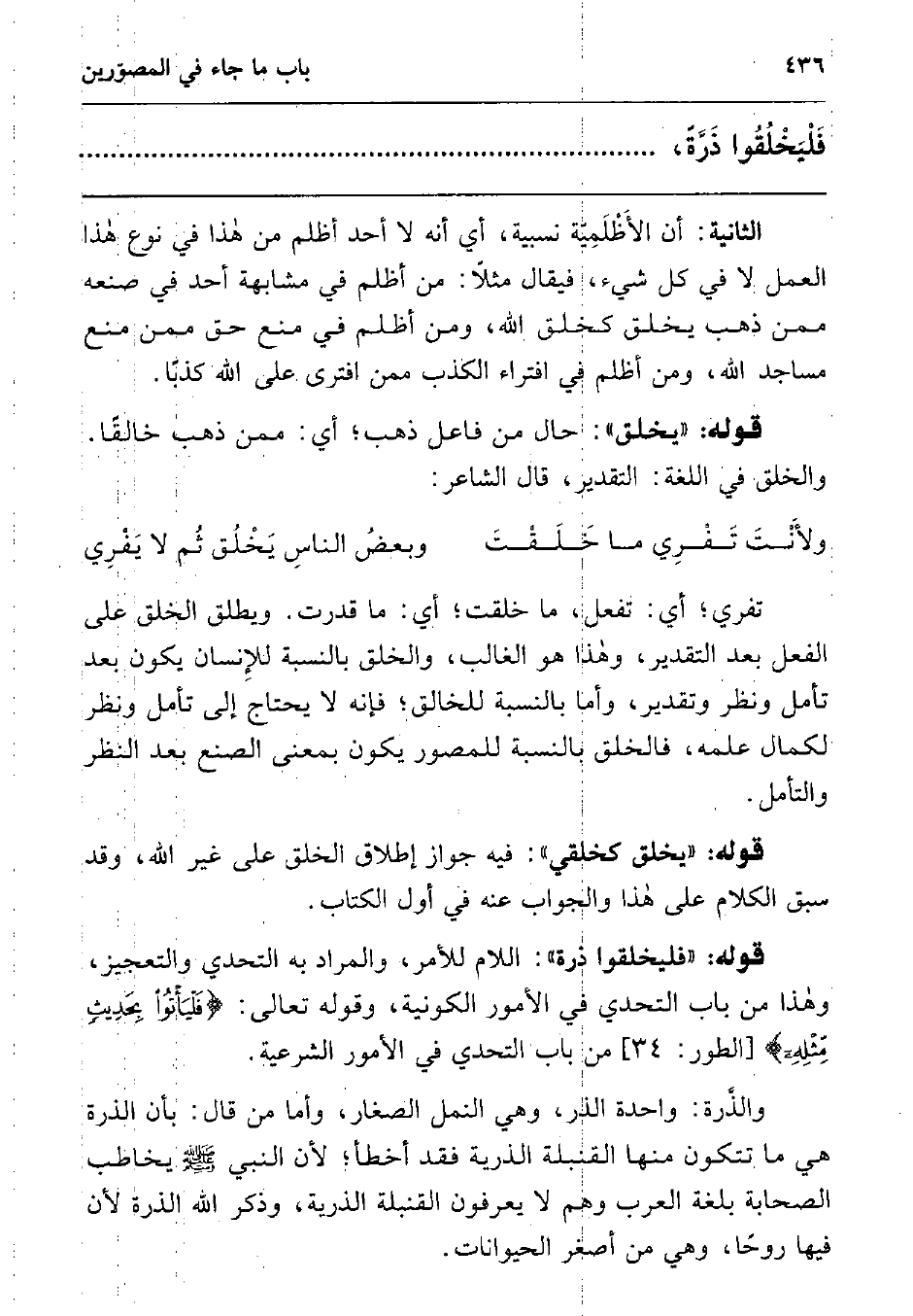 قوله: " فليخلقوا ذرة ": اللام للأمر، والمراد به التحدي والتعجيز، وهذا من باب التحدي في الأمور الكونية، وقوله تعالى: {فَلْيَأْتُوا بِحَدِيثٍ مِثْلِهِ} 1 من باب التحدي في الأمور الشرعية.
