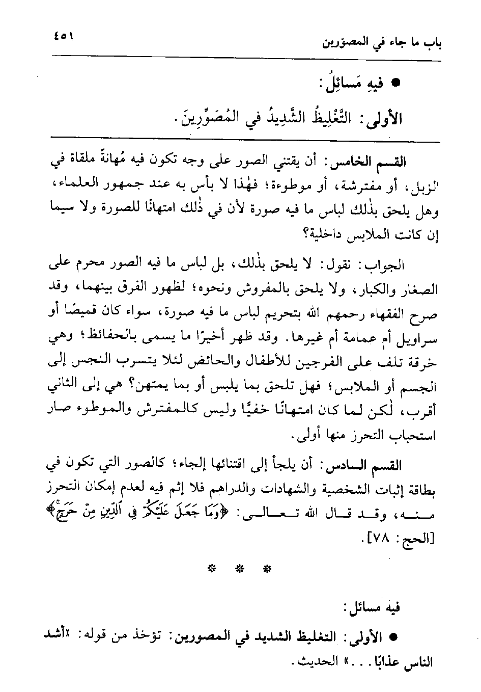 القسم السادس: أن يلجأ إلى اقتنائها إلجاء; كالصور التي تكون في بطاقة إثبات الشخصية والشهادات والدراهم فلا إثم فيه لعدم إمكان التحرز منه، وقد قال الله تعالى: {وَمَا جَعَلَ عَلَيْكُمْ فِي الدِّينِ مِنْ حَرَجٍ} 1.
