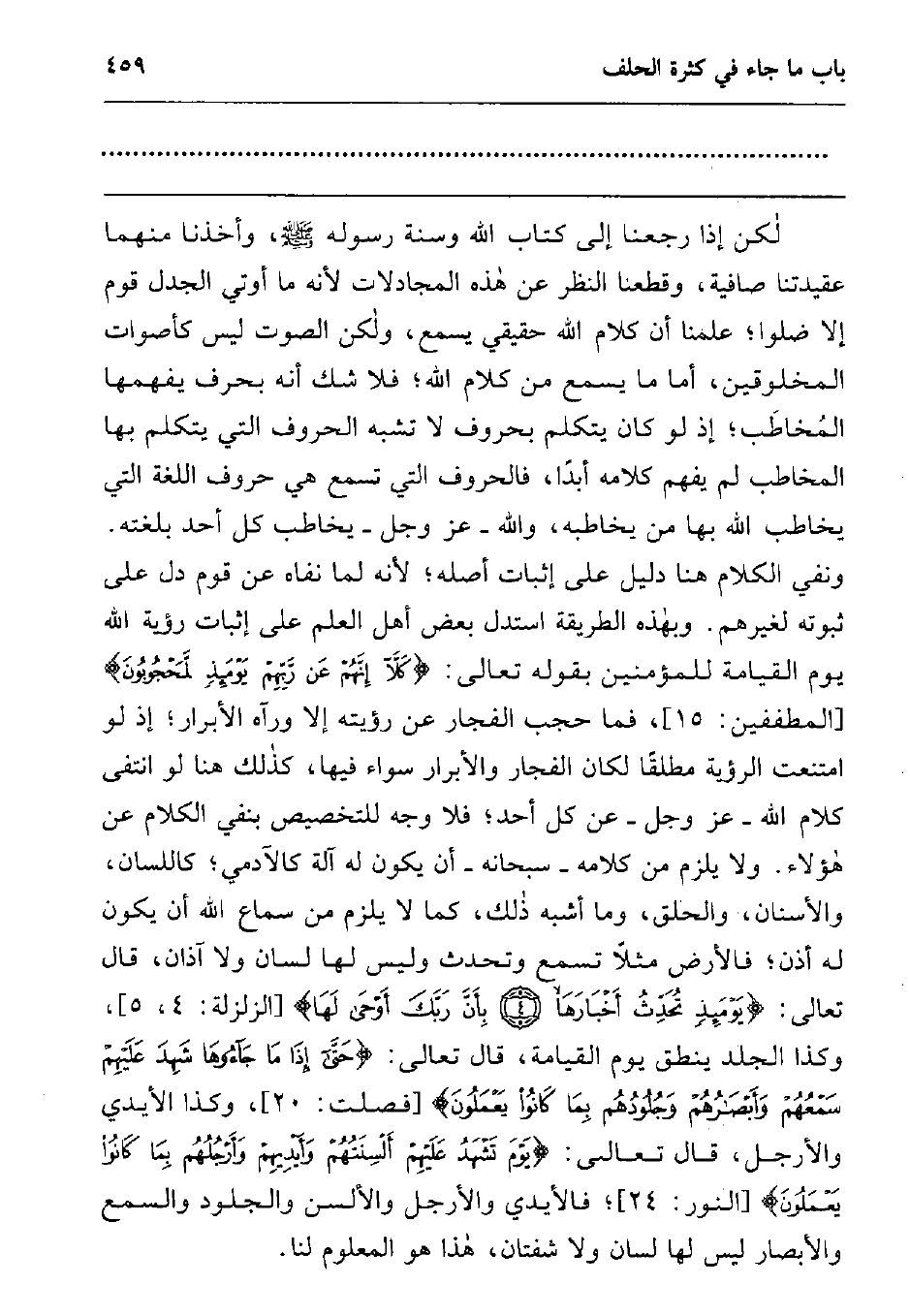 لكن إذا رجعنا إلى كتاب الله وسنة رسوله صلى الله عليه وسلم وأخذنا منهما عقيدتنا صافية، وقطعنا النظر عن هذه المجادلات لأنه ما أوتي الجدل قوم إلا ضلوا; علمنا أن كلام الله حقيقي يسمع، ولكن الصوت ليس كأصوات المخلوقين، أما ما يسمع من كلام الله; فلا شك أنه بحرف يفهمها المخاطب; إذ لو كان يتكلم بحروف لا تشبه الحروف التي يتكلم بها المخاطب لم يفهم كلامه أبدا، فالحروف التي تسمع هي حروف اللغة التي يخاطب الله بها من يخاطبه، والله عز وجل يخاطب كل أحد بلغته. ونفي الكلام هنا دليل على إثبات أصله، لأنه لما نفاه عن قوم دل على ثبوته لغيرهم. وبهذه الطريقة استدل بعض أهل العلم على إثبات رؤية الله يوم القيامة للمؤمنين بقوله تعالى: {كَلاَّ إِنَّهُمْ عَنْ رَبِّهِمْ يَوْمَئِذٍ لَمَحْجُوبُونَ} 1 فما حجب الفجار عن رؤيته إلا ورآه الأبرار; إذ لو امتنعت الرؤية مطلقا لكان الفجار والأبرار سواء فيها، كذلك هنا لو انتفى كلام الله عز وجل عن كل أحد; فلا وجه للتخصيص بنفي الكلام عن هؤلاء. ولا يلزم من كلامه -سبحانه- أن يكون له آلة كالآدمي; كاللسان، والأسنان، والحلق، وما أشبه ذلك، كما لا يلزم من سماع الله أن يكون له أذن; فالأرض مثلا تسمع وتحدث وليس لها لسان ولا آذان، قال تعالى: {يَوْمَئِذٍ تُحَدِّثُ أَخْبَارَهَا بِأَنَّ رَبَّكَ أَوْحَى لَهَا} 2 وكذا الجلد ينطق يوم القيامة، قال تعالى: {حَتَّى إِذَا مَا جَاءُوهَا شَهِدَ عَلَيْهِمْ سَمْعُهُمْ وَأَبْصَارُهُمْ وَجُلُودُهُمْ بِمَا كَانُوا يَعْمَلُونَ} 3 وكذا الأيدي والأرجل، قال تعالى: {يَوْمَ تَشْهَدُ عَلَيْهِمْ أَلْسِنَتُهُمْ وَأَيْدِيهِمْ وَأَرْجُلُهُمْ بِمَا كَانُوا يَعْمَلُونَ} 4 فالأيدي والأرجل والألسن والجلود والسمع والأبصار ليس لها لسان ولا شفتان، هذا هو المعلوم لنا.