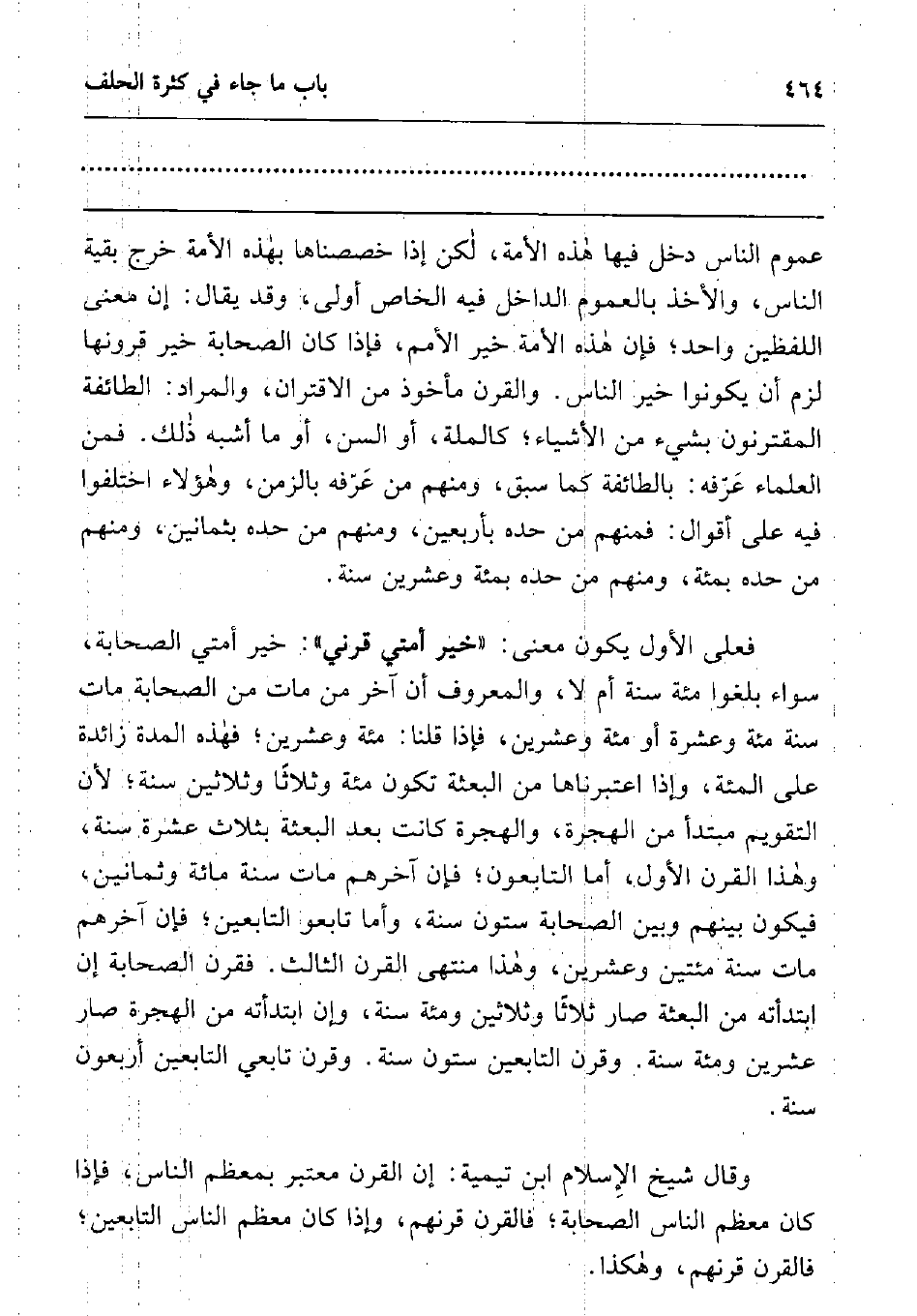 وقال شيخ الإسلام ابن تيمية: إن القرن معتبر بمعظم الناس، فإذا كان معظم الناس الصحابة; فالقرن قرنهم، وإذا كان معظم الناس التابعين; فالقرن قرنهم، وهكذا.