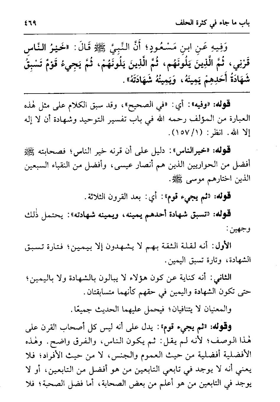 وقوله: "ثم يجيء قوم": يدل على أنه ليس كل أصحاب القرن على هذا الوصف; لأنه لم يقل: ثم يكون الناس، والفرق واضح. وهذه الأفضلية أفضلية من حيث العموم والجنس، لا من حيث الأفراد; فلا يعني أنه لا يوجد في تابعي التابعين من هو أفضل من التابعين، أو لا يوجد في التابعين من هو أعلم من بعض الصحابة، أما فضل الصحبة; فلا