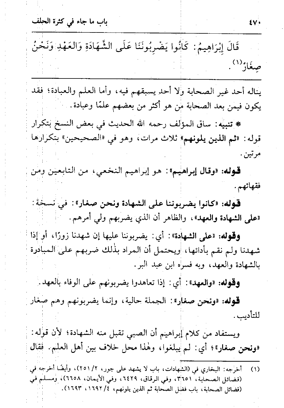 "قال إبراهيم: كانوا يضربوننا على الشهادة والعهد ونحن صغار"1.