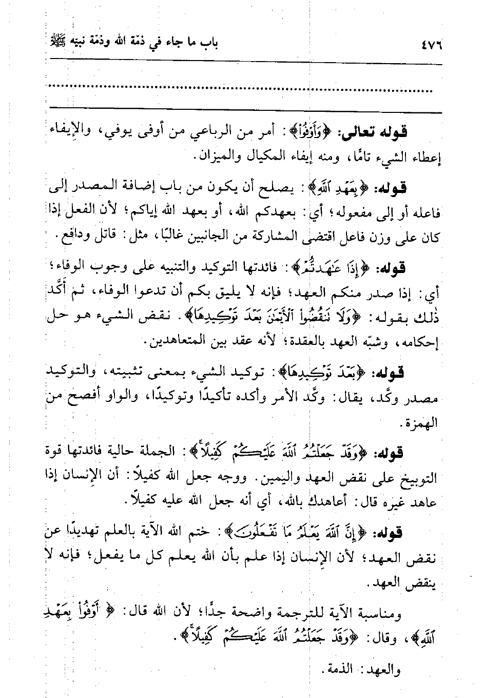 ومناسبة الآية للترجمة واضحة جدا; لأن الله قال: {وَأَوْفُوا بِعَهْدِ اللَّهِ} 4 وقال: {وَقَدْ جَعَلْتُمُ اللَّهَ عَلَيْكُمْ كَفِيلاً} 5.
