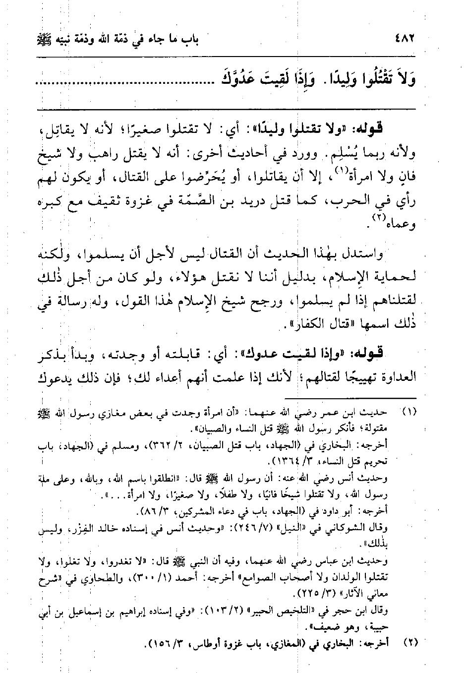 1 حديث ابن عمر رضي الله عنهما: "أن امرأة وجدت في بعض مغازي رسول الله صلى الله عليه وسلم مقتولة; فأنكر رسول الله صلى الله عليه وسلم قتل النساء والصبيان". أخرجه: البخاري في (الجهاد, باب قتل الصبيان, 2/362) , ومسلم في (الجهاد, باب تحريم قتل النساء, 3/1364) . وحديث أنس رضي الله عنه: أن رسول الله صلى الله عليه وسلم قال: انطلقوا باسم الله, وبالله, وعلى ملة رسول الله, ولا تقتلوا شيخا فانيا, ولا طفلا, ولا صغيرا, ولا امرأة ... ". أخرجه: أبو داود في (الجهاد, باب في دعاء المشركين, 3/86) . وقال الشوكاني في "النيل" (7/246) : "وحديث أنس في إسناده خالد الفِزْر, وليس بذلك". وحديث ابن عباس رضي الله عنهما, وفيه أن النبي صلى الله عليه وسلم قال: لا تغدروا, ولا تغلوا, ولا تقتلوا الولدان ولا أصحاب الصوامع أخرجه: أحمد (1/300) , والطحاوي في "شرح معاني الآثار" (3/225) . وقال ابن حجر في "التلخيص الحبير" (2/103) : "وفي إسناده إبراهيم بن إسماعيل بن أبي حبيبة, وهو ضعيف".
