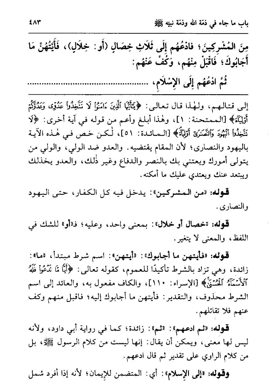 من المشركين; فادعهم إلى ثلاث خصال (أو: خلال) ، فأيتهن ما أجابوك; فاقبل منهم، وكف عنهم:
