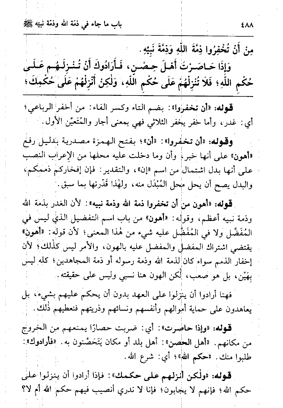 من أن تخفروا ذمة الله وذمة نبيه وإذا حاصرت أهل حصن، فأرادوك أن تنزلهم على حكم الله; فلا تنزلهم على حكم الله، ولكن أنزلهم على حكمك،