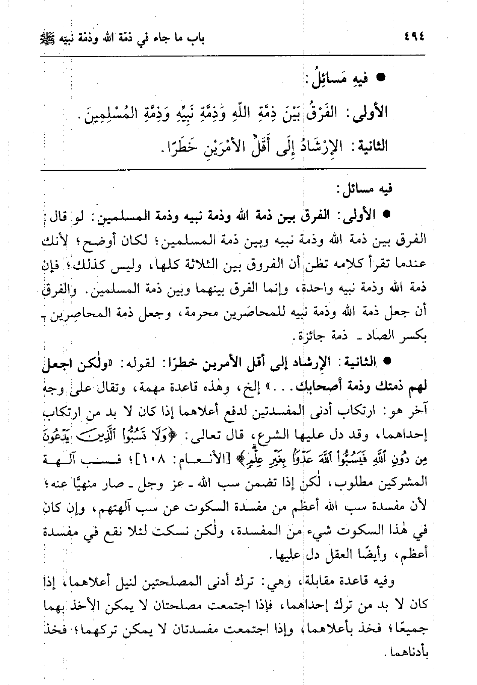 الثانية: الإرشاد إلى أقل الأمرين خطرا: لقوله: "ولكن اجعل لهم ذمتك وذمة أصحابك ... " إلخ، وهذه قاعدة مهمة، وتقال على وجه آخر هو: ارتكاب أدنى المفسدتين لدفع أعلاهما إذا كان لا بد من ارتكاب إحداهما وقد دل عليها الشرع، قال تعالى: {وَلا تَسُبُّوا الَّذِينَ يَدْعُونَ مِنْ دُونِ اللَّهِ فَيَسُبُّوا اللَّهَ عَدْواً بِغَيْرِ عِلْمٍ} 1 ; فسب آلهة المشركين مطلوب، لكن إذا تضمن سب الله عز وجل صار منهيا عنه; لأن مفسدة سب الله أعظم من مفسدة السكوت عن سب آلهتهم، وإن كان في هذا السكوت شيء من المفسدة، ولكن نسكت لئلا نقع في مفسدة أعظم، وأيضا العقل دل عليها.