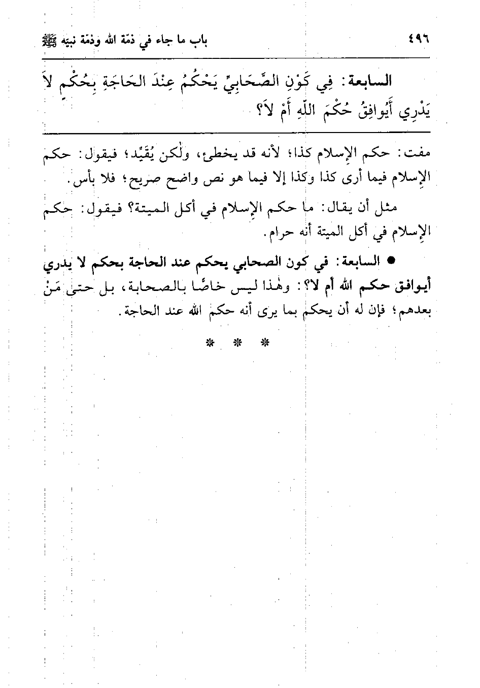 السابعة: في كون الصحابي يحكم عند الحاجة بحكم لا يدري أيوافق حكم الله أم لا؟ وهذا ليس خاصا بالصحابة، بل حتى من بعدهم; فإن له أن يحكم بما يرى أنه حكم الله عند الحاجة.