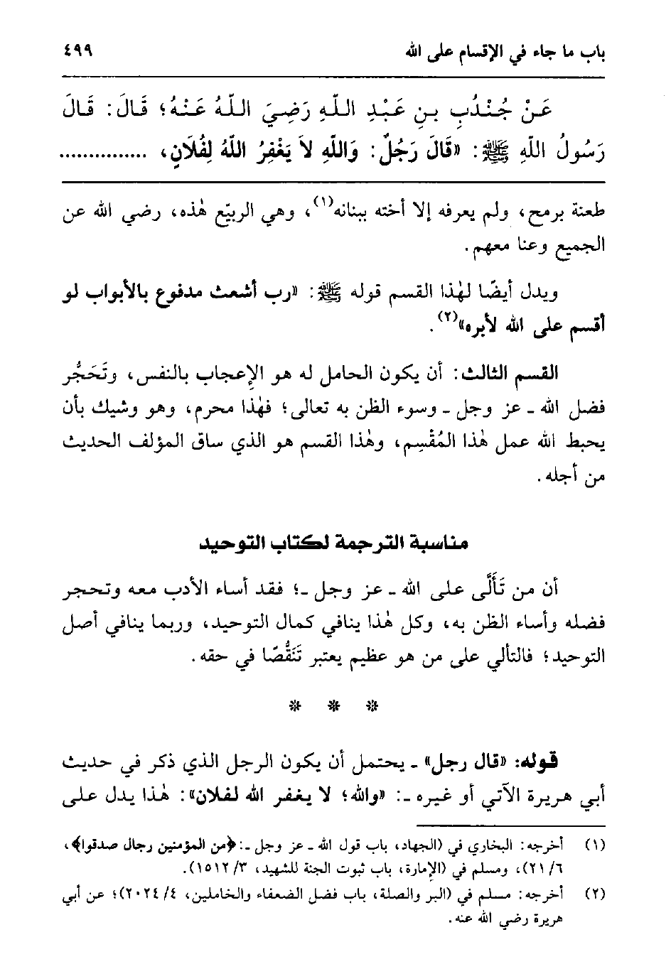 عن جندب بن عبد الله رضي الله عنه قال: قال رسول الله صلى الله عليه وسلم " قال رجل: والله لا يغفر الله لفلان،................................................