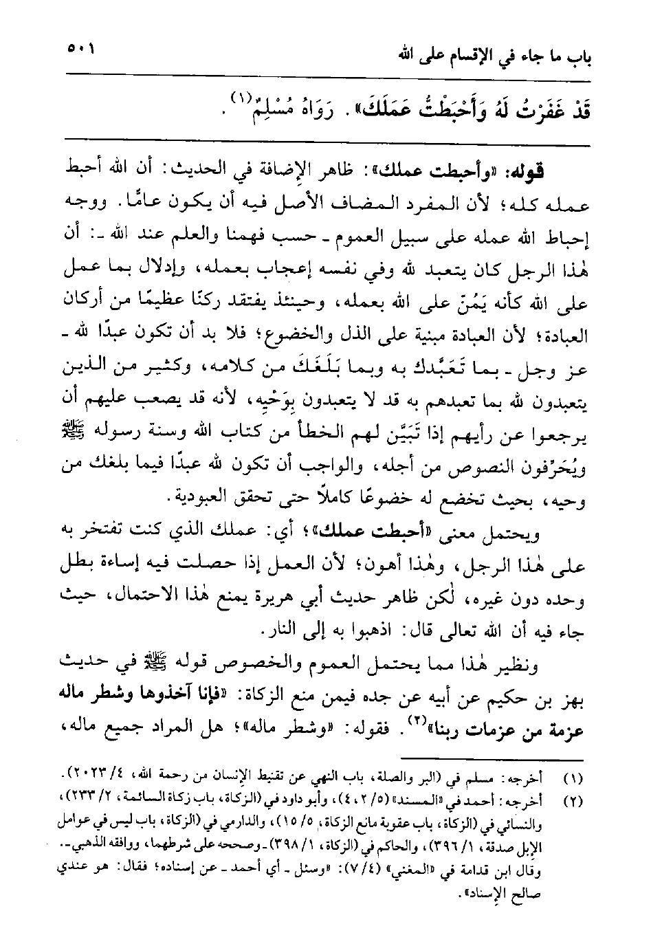 قوله: " وأحبطت عملك ": ظاهر الإضافة في الحديث: أن الله أحبط عمله كله; لأن المفرد المضاف الأصل فيه أن يكون عاما. ووجه إحباط الله عمله على سبيل العموم -حسب فهمنا والعلم عند الله-: أن هذا الرجل كان يتعبد لله وفي نفسه إعجاب بعمله، وإذلال بما عمل على الله كأنه يمن على الله بعمله، وحينئذ يفتقد ركنا عظيما من أركان العبادة; لأن العبادة مبنية على الذل والخضوع; فلا بد أن تكون عبدا لله عز وجل بما تعبدك به وبما بلغك من كلامه، وكثير من الذين يتعبدون لله بما تعبدهم به قد لا يتعبدون بوحيه، لأنه قد يصعب عليهم أن يرجعوا عن رأيهم إذا تبين لهم الخطأ من كتاب الله وسنة رسوله صلى الله عليه وسلم ويحرفون النصوص من أجله، والواجب أن تكون لله عبدا فيما بلغك من وحيه، بحيث تخضع له خضوعا كاملا حتى تحقق العبودية.