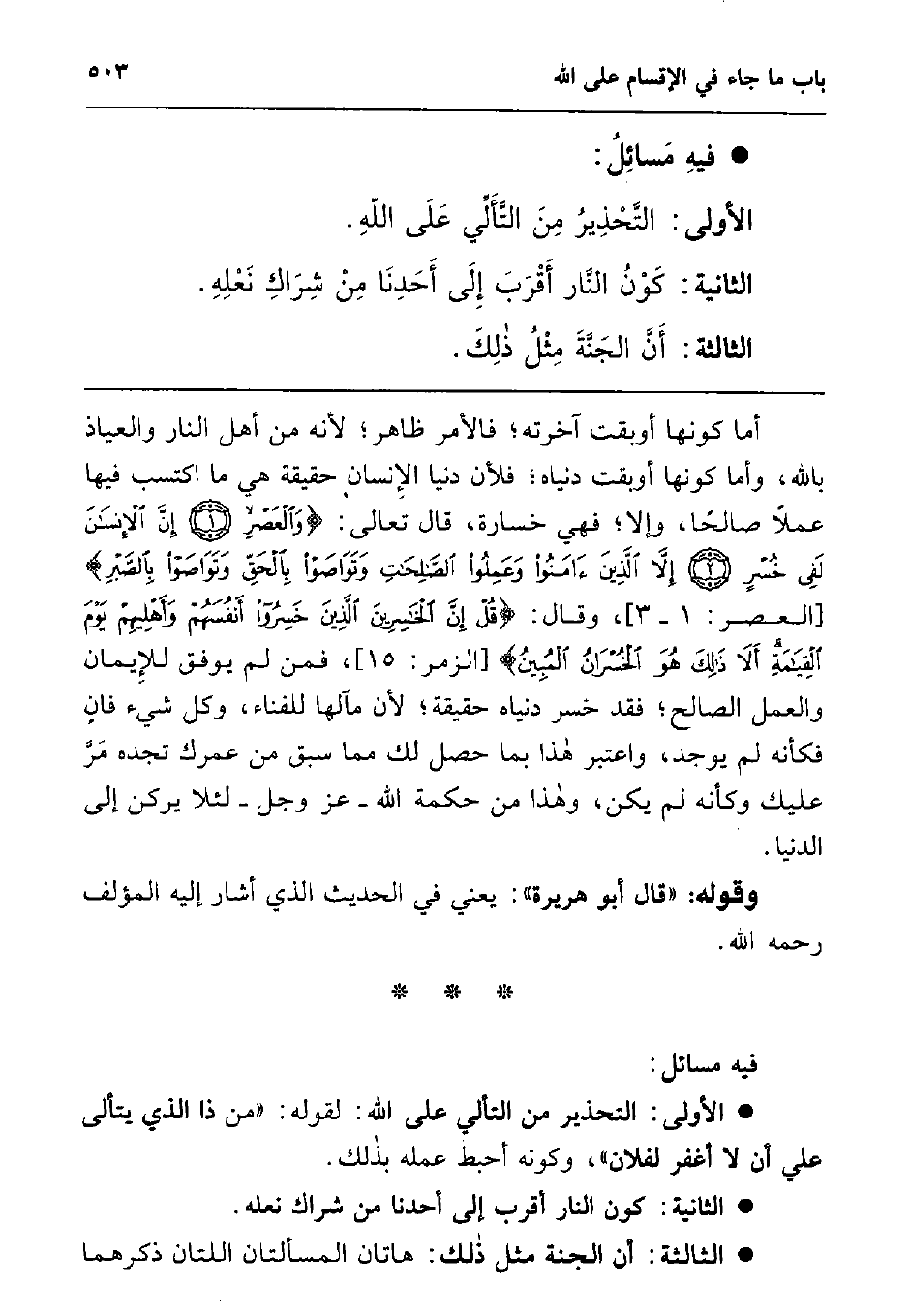 الأولى: التحذير من التألي على الله لقوله: "من ذا الذي يتألى علي أن لا أغفر لفلان"3 وكونه أحبط عمله بذلك.