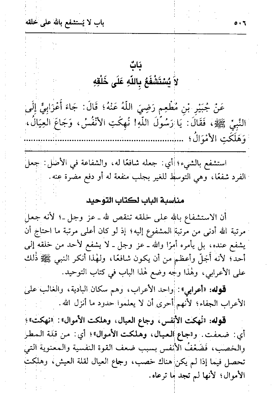 أن الاستشفاع بالله على خلقه تنقص لله عز وجل لأنه جعل مرتبة الله أدنى من مرتبة المشفوع إليه; إذ لو كان أعلى مرتبة ما احتاج أن يشفع عنده، بل يأمره أمرا والله عز وجل لا يشفع لأحد من خلقه إلى أحد; لأنه أَجَلّ وأعظم من أن يكون شافعا، ولهذا أنكر النبي صلى الله عليه وسلم ذلك على الأعرابي، وهذا وجه وضع هذا الباب في كتاب التوحيد.