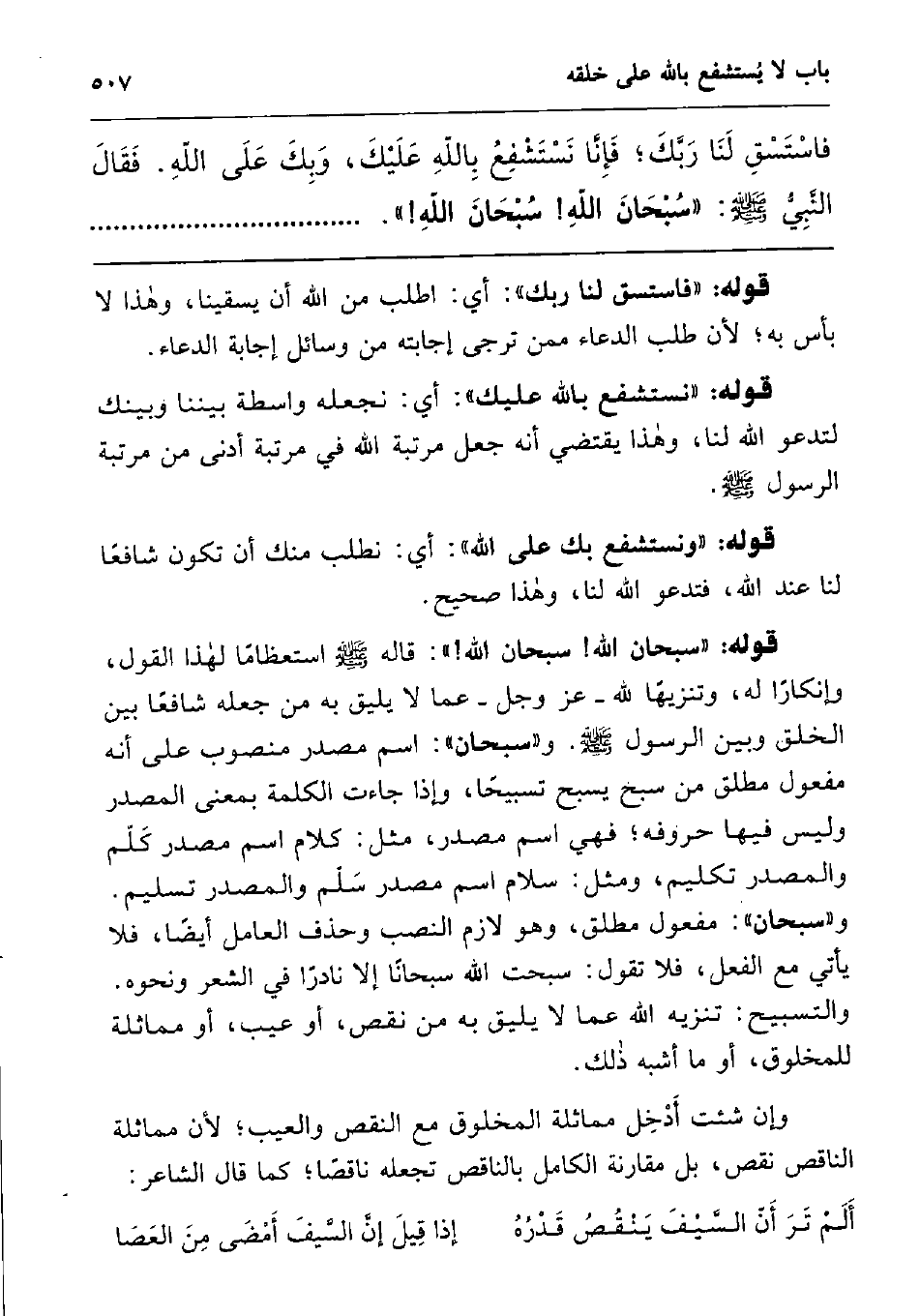 فاستسق لنا ربك; فإنا نستشفع بالله عليك، وبك على الله. فقال النبي صلى الله عليه وسلم سبحان الله! سبحان الله! ...............................................