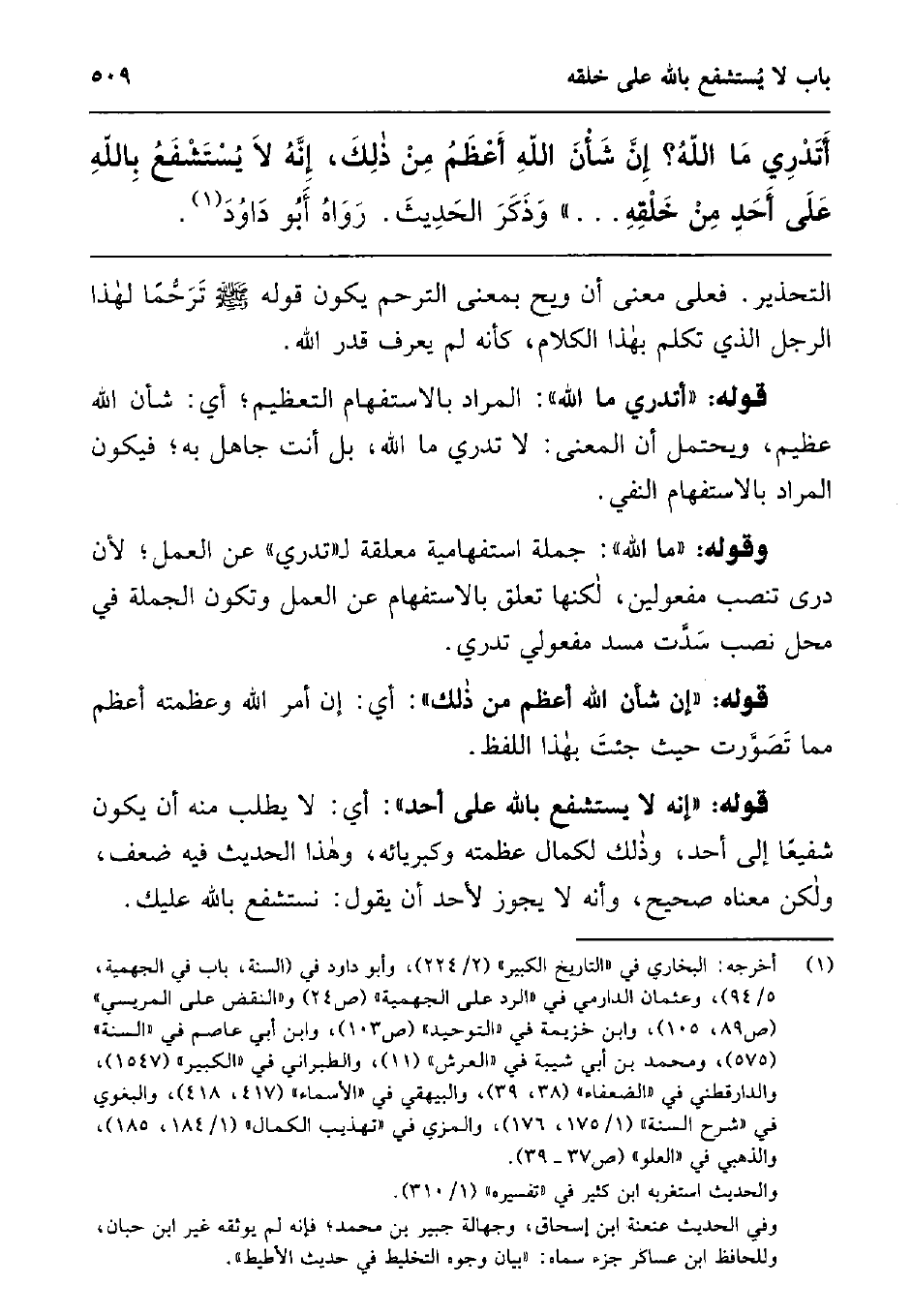 أتدري ما الله؟ إن شأن الله أعظم من ذلك، إنه لا يستشفع بالله على أحد من خلقه ... "" وذكر الحديث. رواه أبو داود1.