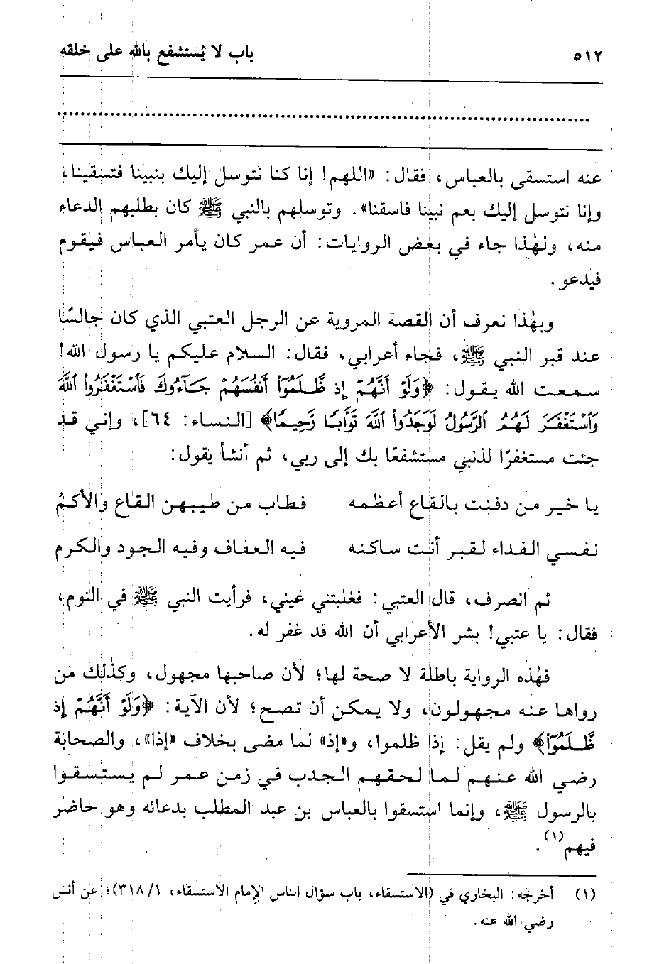 وبهذا نعرف أن القصة المروية عن الرجل العتبي الذي كان جالسا عند قبر النبي صلى الله عليه وسلم فجاء أعرابي، فقال: السلام عليكم يا رسول الله! سمعت الله يقول: {وَلَوْ أَنَّهُمْ إِذْ ظَلَمُوا أَنْفُسَهُمْ جَاءُوكَ فَاسْتَغْفَرُوا اللَّهَ وَاسْتَغْفَرَ لَهُمُ الرَّسُولُ لَوَجَدُوا اللَّهَ تَوَّاباً رَحِيماً} 1، وإني قد جئت مستغفرا لذنبي مستشفعا بك إلى ربي، ثم أنشأ يقول: