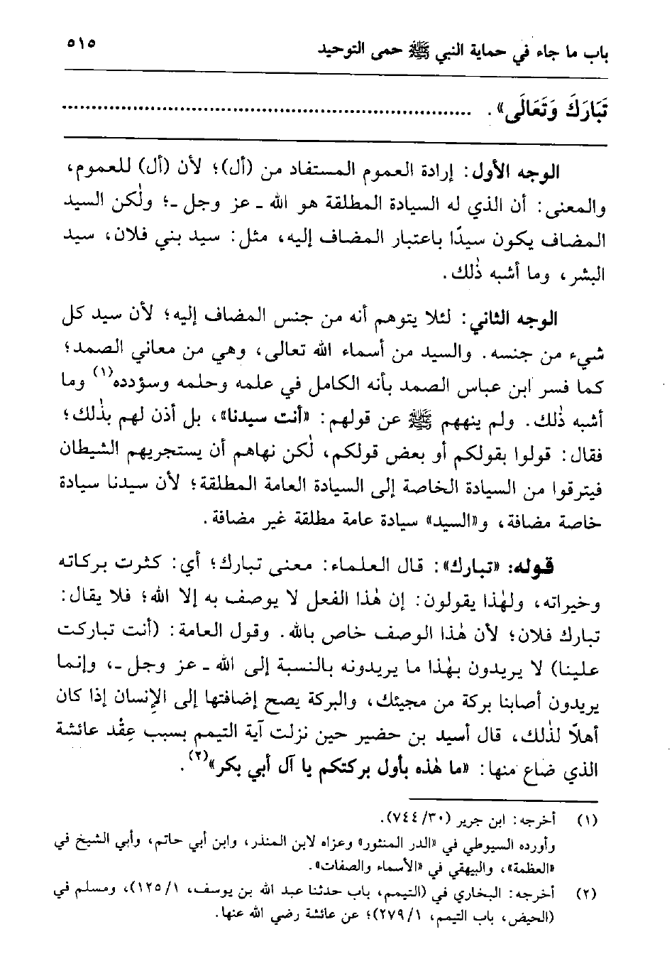 الوجه الثاني: لئلا يتوهم أنه من جنس المضاف إليه; لأن سيد كل شيء من جنسه. والسيد من أسماء الله تعالى، وهي من معاني الصمد; كما فسر ابن عباس الصمد بأنه الكامل في علمه وحلمه وسؤدده1 وما أشبه ذلك. ولم ينههم صلى الله عليه وسلم عن قولهم: "أنت سيدنا"، بل أذن لهم بذلك; فقال: قولوا بقولكم أو بعض قولكم، لكن نهاهم أن يستجريهم الشيطان فيترقوا من السيادة الخاصة إلى السيادة العامة المطلقة; لأن سيدنا سيادة خاصة مضافة، و"السيد" سيادة عامة مطلقة غير مضافة.