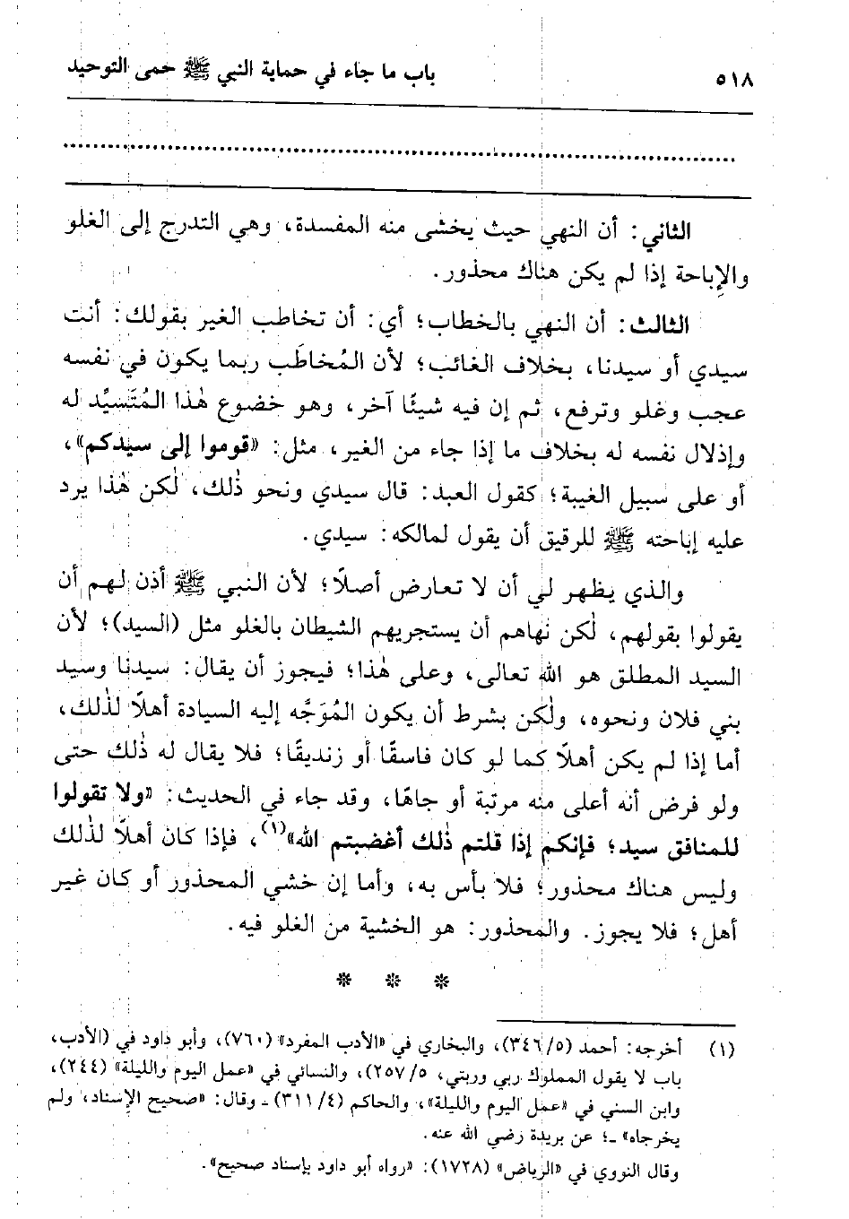 الثالث: أن النهي بالخطاب; أي: أن تخاطب الغير بقولك: أنت سيدي أو سيدنا، بخلاف الغائب; لأن المخاطب ربما يكون في نفسه عجب وغلو وترفع، ثم إن فيه شيئا آخر، وهو خضوع هذا المتسيد له وإذلال نفسه له بخلاف ما إذا جاء من الغير، مثل: "قوموا إلى سيدكم"، أو على سبيل الغيبة; كقول العبد: قال سيدي ونحو ذلك، لكن هذا يرد عليه إباحته صلى الله عليه وسلم للرقيق أن يقول لمالكه: سيدي.