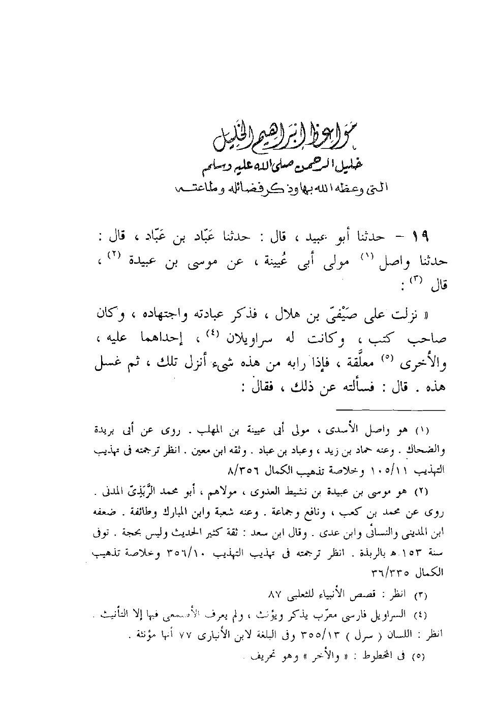 19 - حدثنا أبو عبيد قال حدثنا عباد بن عباد قال حدثنا واصل مولى أبي عيينة عن موسى بن عبيدة قال