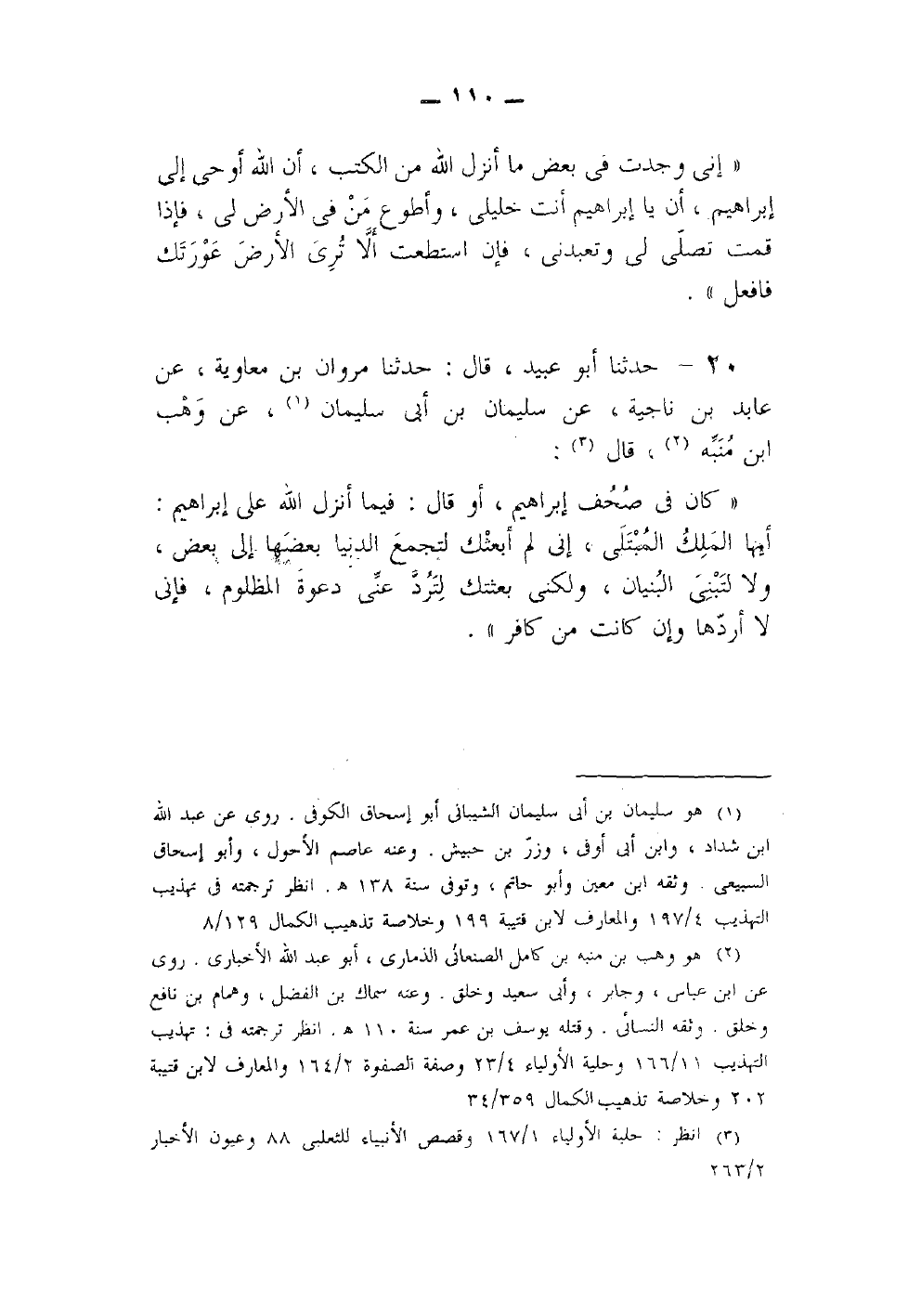 20 - حدثنا أبو عبيد قال حدثنا مروان بن معاوية عن عابد بن ناجية عن سليمان بن أبي سليمان عن وهب بن منبه قال: