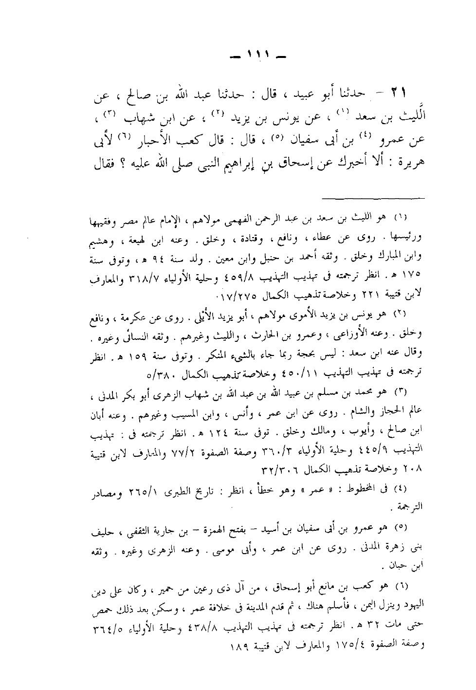 21 - حدثنا أبو عبيد قال حدثنا عبد الله بن صالح عن الليث بن سعد عن يونس بن يزيد عن ابن شهاب عن عمرو (¬1) بن أبي سفيان قال قال كعب الأحبار لأبي هريرة ألا أخبرك عن إسحاق بن إبراهيم النبي صلى الله عليه فقال -[112]- أبو هريرة بلى فقال كعب: