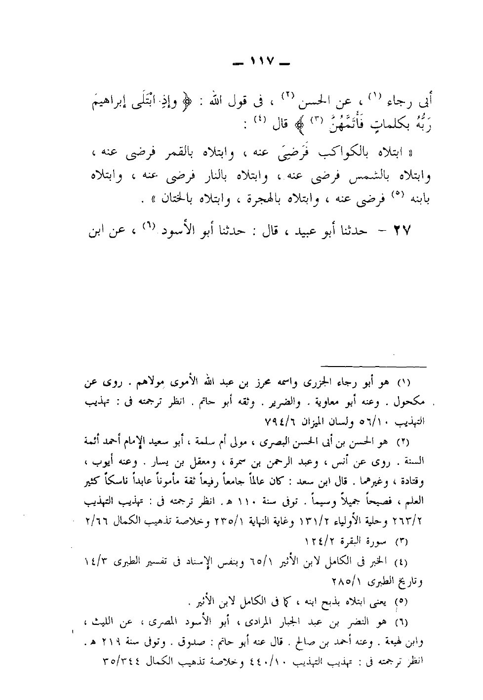 27 - حدثنا أبو عبيد قال حدثنا أبو الأسود عن ابن -[118]- لهيعة عن عبد الله بن هبيرة عن حنش الصنعاني عن ابن عباس في قوله عز وجل {وإذ ابتلى إبراهيم ربه بكلمات} قال