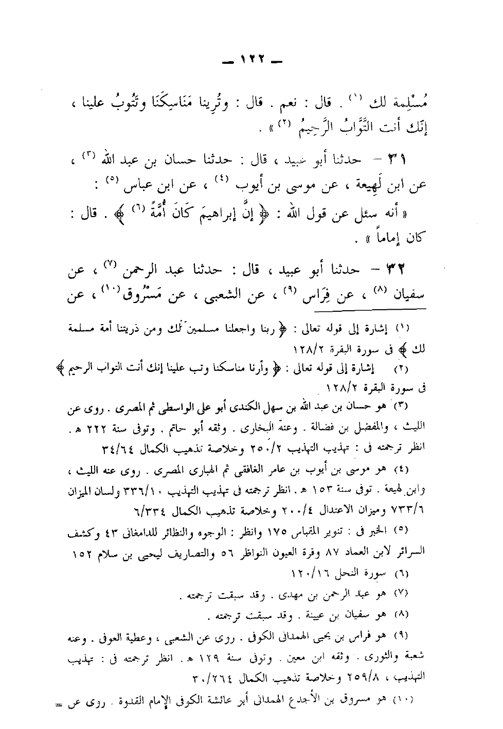 32 - حدثنا أبو عبيد قال حدثنا عبد الرحمن عن سفيان عن فراس عن الشعبي عن مسروق عن -[123]- عبد الله أنه قال