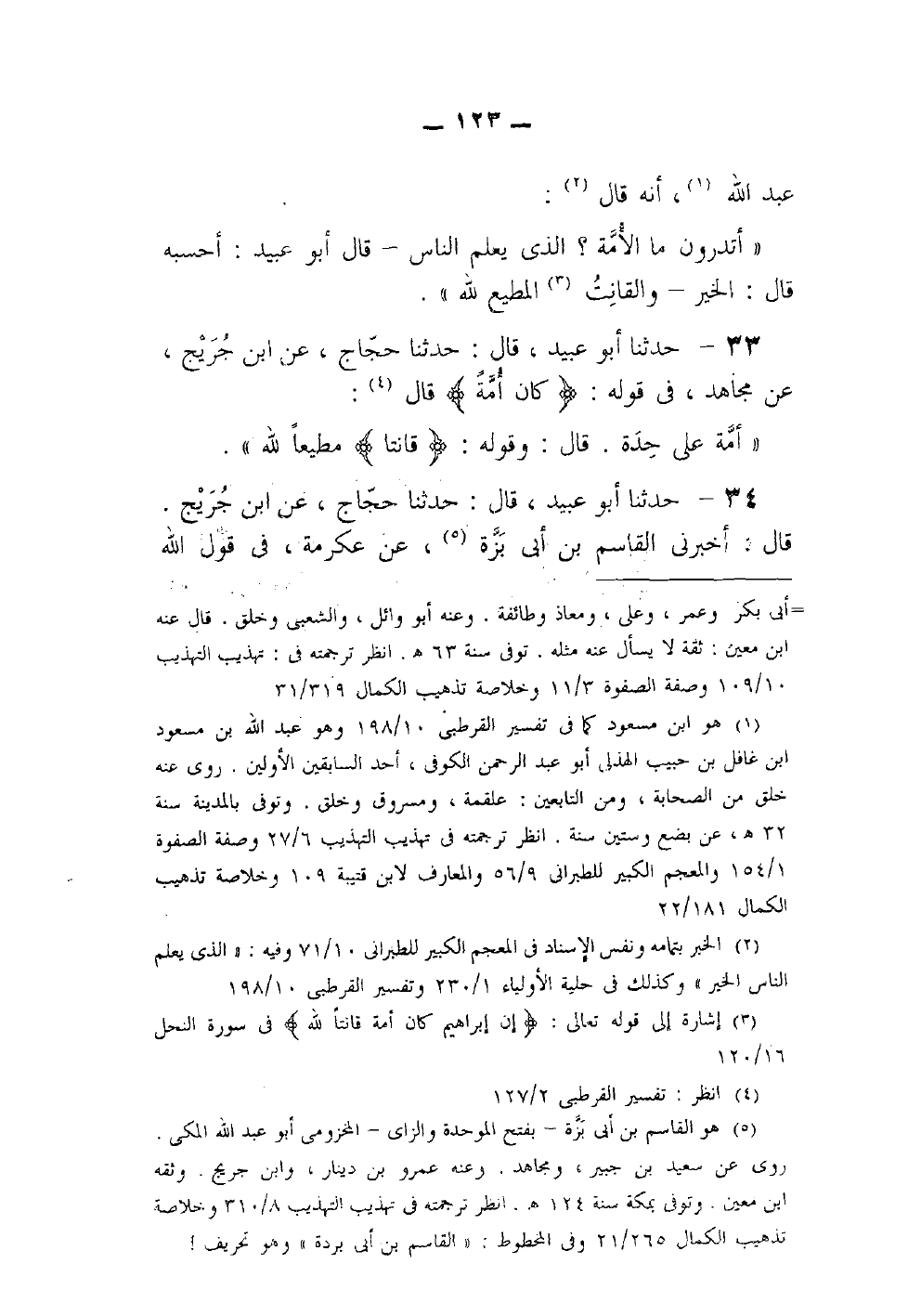 33 - حدثنا أبو عبيد قال حدثنا حجاج عن ابن جريج عن مجاهد في قوله {كان أمة} قال