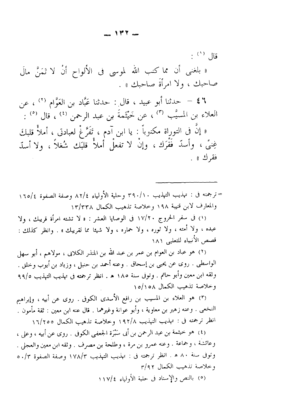 46 - حدثنا أبو عبيد قال حدثنا عباد بن العوام عن العلاء بن المسيب عن خيثمة بن عبد الرحمن قال إن في التوراة مكتوبا يا ابن آدم تفرغ لعبادتي أملأ قلبك غنى وأسد فقرك وإن لا تفعل أملأ قلبك شغلا ولا أسد فقرك