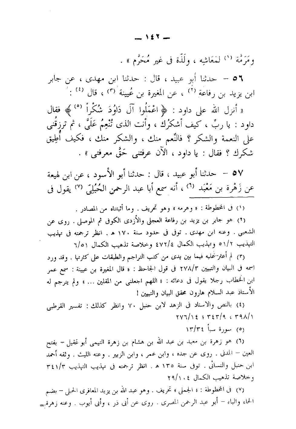 57 - حدثنا أبو عبيد قال حدثنا أبو الأسود عن ابن لهيعة عن زهرة بن معبد أنه سمع أبا عبد الرحمن الحبلي يقول في -[143]- قول الله {اعملوا آل داود شكرا} قال: