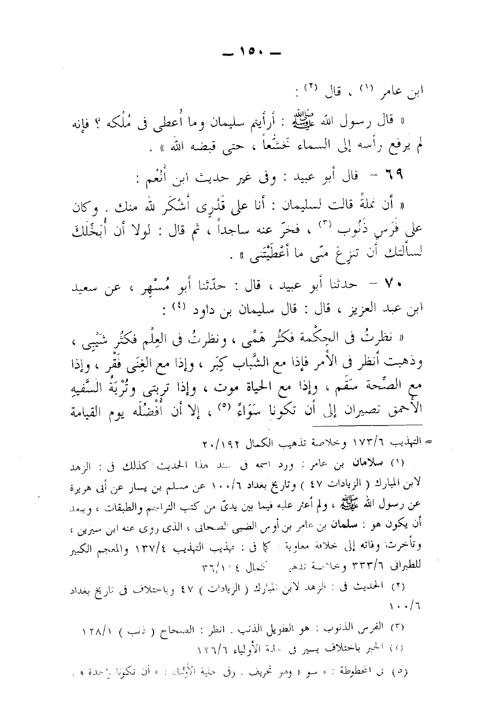 نظرت في الحكمة فكثر همي ونظرت في العلم فكثر شيبي وذهبت أنظر في الأمر فإذا مع الشباب كبر وإذا مع الغنى فقر وإذا مع الصحة سقم وإذا مع الحياة موت وإذا تربتي وتربة السفيه الأحمق تصيران إلى أن تكونا سواء إلا أن أفضله يوم القيامة -[151]- بعمل صالح فكيف يهنيني مع هذا طعام أو شراب