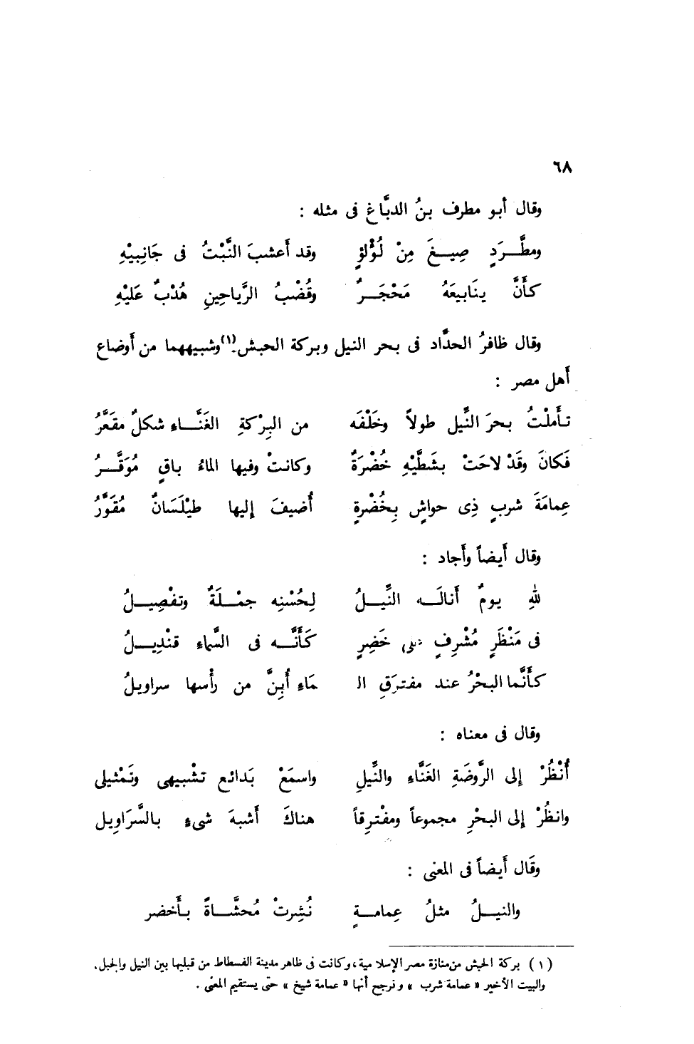 وقال ظافرُ الحداد في بحر النيل وبركة الحبش وشبيههما من أوضاع أهل مصر:
