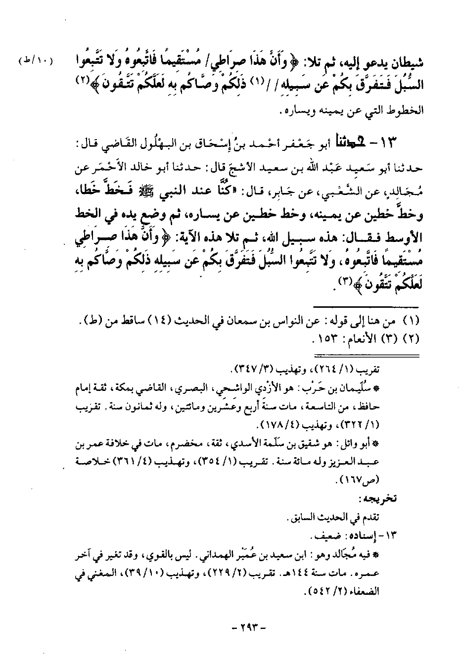 13 - وَحَدَّثَنَا أَبُو جَعْفَرٍ أَحْمَدُ بْنُ إِسْحَاقَ بْنِ الْبُهْلُولِ الْقَاضِي قَالَ: ثنا أَبُو سَعِيدٍ عَبْدُ اللَّهِ بْنُ سَعِيدٍ الْأَشَجُّ قَالَ: حَدَّثَنَا أَبُو خَالِدٍ الْأَحْمَرُ، عَنْ مُجَالِدٍ، عَنِ الشَّعْبِيِّ، عَنْ جَابِرٍ قَالَ: كُنَّا عِنْدَ النَّبِيِّ صَلَّى اللهُ عَلَيْهِ وَسَلَّمَ فَخَطَّ خَطًّا، وَخَطَّ خَطَّيْنِ عَنْ يَمِينِهِ، وَخَطَّ خَطَّيْنِ عَنْ يَسَارِهِ ثُمَّ وَضَعَ يَدَهُ فِي الْخَطِّ الْأَوْسَطِ، فَقَالَ: «هَذَا سَبِيلُ اللَّهِ» ، ثُمَّ تَلَا هَذِهِ الْآيَةَ: {§وَأَنَّ هَذَا صِرَاطِي مُسْتَقِيمًا فَاتَّبِعُوهُ وَلَا تَتَّبِعُوا السُّبُلَ فَتَفَرَّقَ بِكُمْ عَنْ سَبِيلِهِ} [الأنعام: 153]