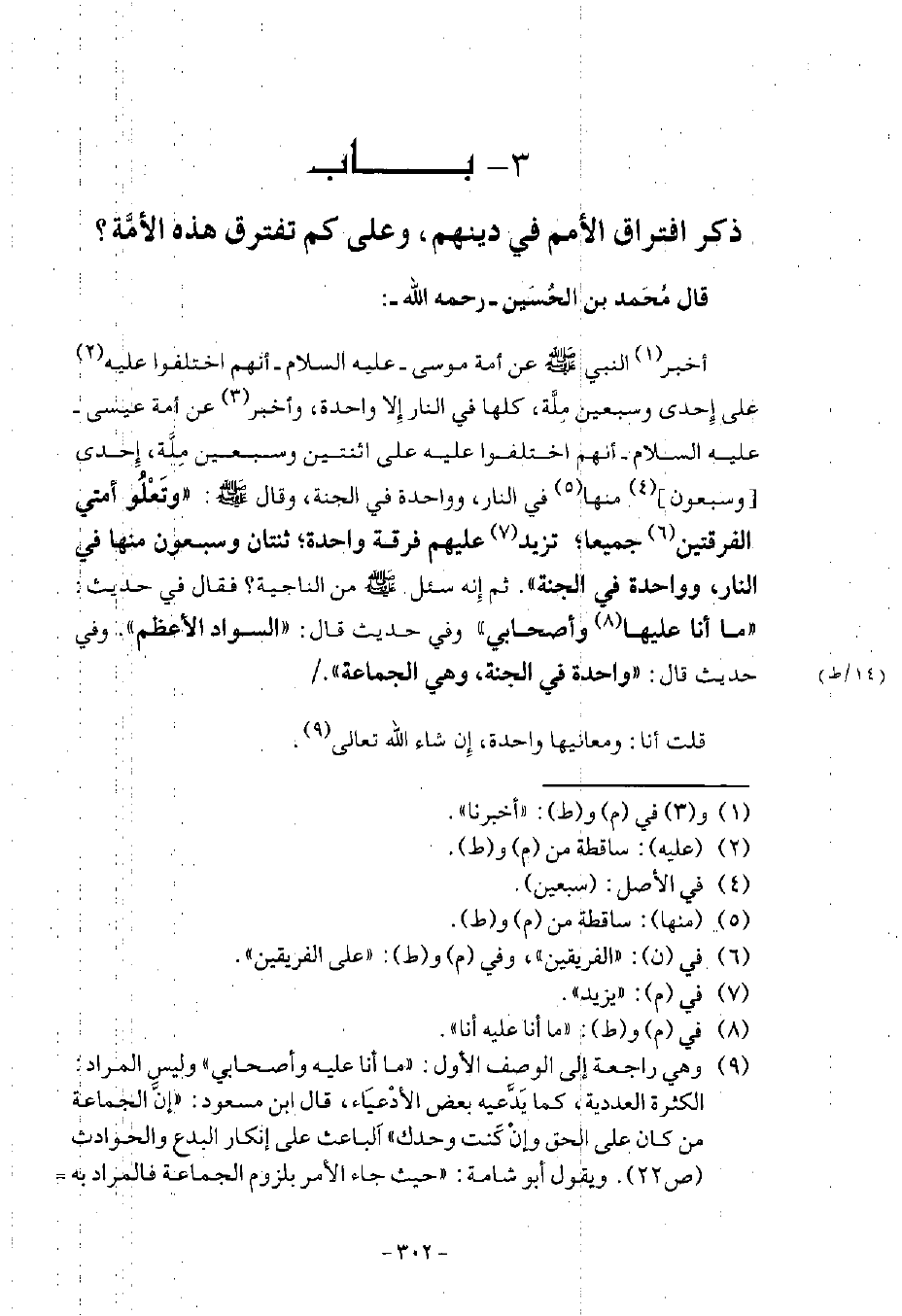 §بَابُ ذِكْرِ افْتِرَاقِ الْأُمَمِ فِي دِينِهِمْ وَعَلَى كَمْ تَفْتَرِقُ هَذِهِ الْأُمَّةُ؟ قَالَ مُحَمَّدُ بْنُ الْحُسَيْنِ رَحِمَهُ اللَّهُ: أَخْبَرَنَا النَّبِيُّ صَلَّى اللهُ عَلَيْهِ وَسَلَّمَ: عَنْ أُمَّةِ مُوسَى عَلَيْهِ السَّلَامُ: «أَنَّهُمُ اخْتَلَفُوا عَلَى إِحْدَى وَسَبْعِينَ مِلَّةً، كُلُّهَا فِي النَّارِ إِلَّا وَاحِدَةً» ، وَأَخْبَرَنَا عَنْ أُمَّةِ عِيسَى عَلَيْهِ السَّلَامُ أَنَّهُمُ اخْتَلَفُوا عَلَيْهِ عَلَى اثْنَتَيْنِ وَسَبْعِينَ مِلَّةً، إِحْدَى وَسَبْعُونَ مِنْهَا فِي النَّارِ وَوَاحِدَةٌ فِي الْجَنَّةِ، قَالَ صَلَّى اللهُ عَلَيْهِ وَسَلَّمَ: «وَتَعْلُو أُمَّتِي الْفَرِيقَيْنِ جَمِيعًا تَزِيدُ عَلَيْهِمْ فِرْقَةً وَاحِدَةً، ثِنْتَانِ وَسَبْعُونَ مِنْهَا فِي النَّارِ وَوَاحِدَةٌ فِي الْجَنَّةِ» ثُمَّ إِنَّهُ سُئِلَ صَلَّى اللهُ عَلَيْهِ وَسَلَّمَ: «مَنِ النَّاجِيَةُ؟» فَقَالَ فِي حَدِيثٍ: «مَا أَنَا عَلَيْهِ وَأَصْحَابِي» وَفِي حَدِيثٍ قَالَ: «السَّوَادُ الْأَعْظَمُ» وَفِي حَدِيثٍ قَالَ: «وَاحِدَةٌ فِي الْجَنَّةِ، وَهِيَ الْجَمَاعَةُ» قُلْتُ أَنَا: وَمَعَانِيهَا وَاحِدَةٌ إِنْ شَاءَ اللَّهُ تَعَالَى