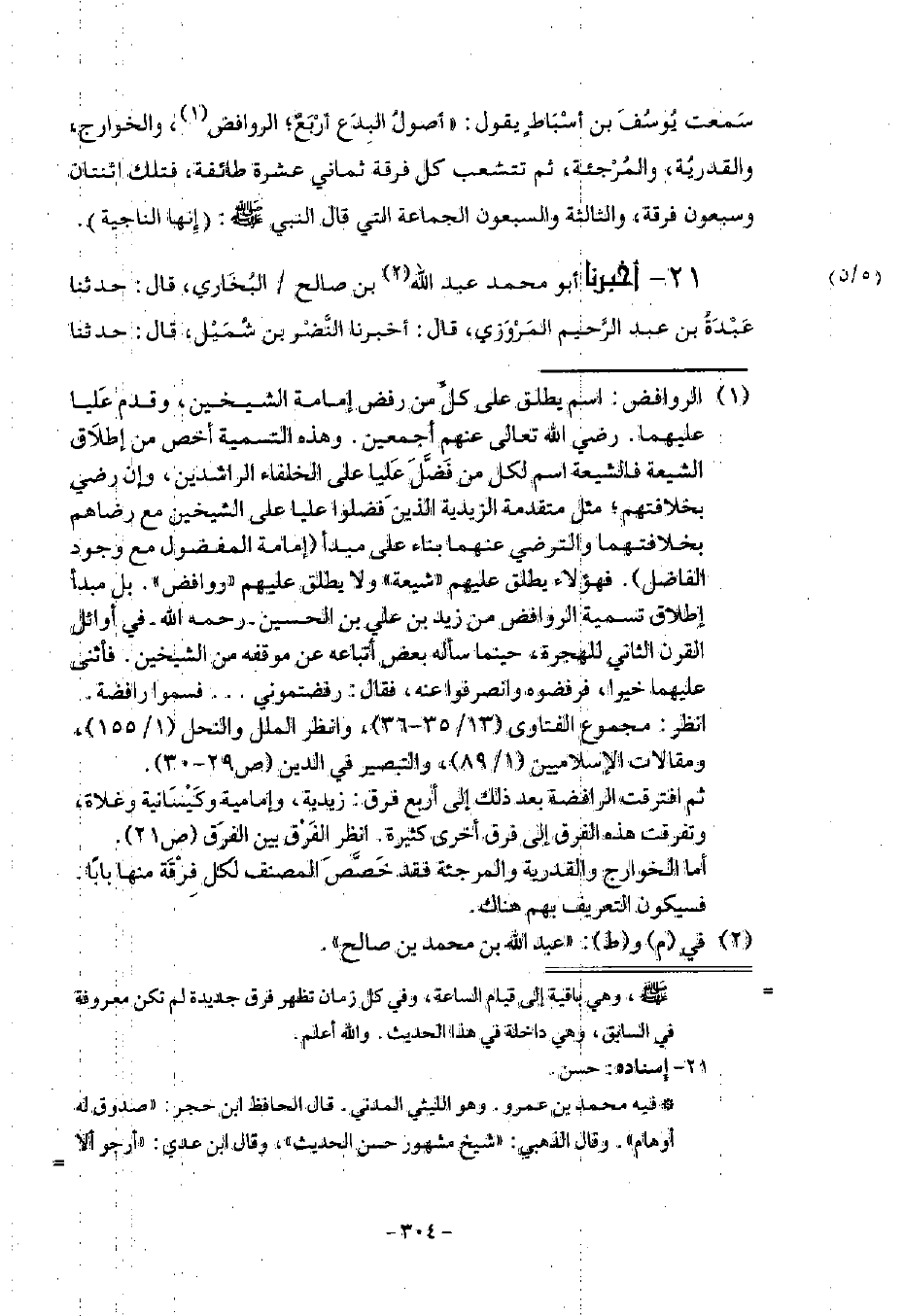 21 - أَخْبَرَنَا أَبُو مُحَمَّدٍ عَبْدُ اللَّهِ بْنُ صَالِحٍ الْبُخَارِيُّ قَالَ: حَدَّثَنَا عَبْدَةُ بْنُ عَبْدِ الرَّحِيمِ الْمَرْوَزِيُّ قَالَ: نا النَّضْرُ بْنُ شُمَيْلٍ قَالَ: نا -[306]- مُحَمَّدُ بْنُ عَمْرٍو، عَنْ أَبِي سَلَمَةَ، عَنْ أَبِي هُرَيْرَةَ رَضِيَ اللَّهُ عَنْهُ قَالَ: قَالَ رَسُولُ اللَّهِ صَلَّى اللهُ عَلَيْهِ وَسَلَّمَ: «§تَفَرَّقَ الْيَهُودُ وَالنَّصَارَى عَلَى إِحْدَى، أَوِ اثْنَتَيْنِ وَسَبْعِينَ فِرْقَةً وَتَفْتَرِقُ أُمَّتِي عَلَى ثَلَاثٍ وَسَبْعِينَ فِرْقَةً»