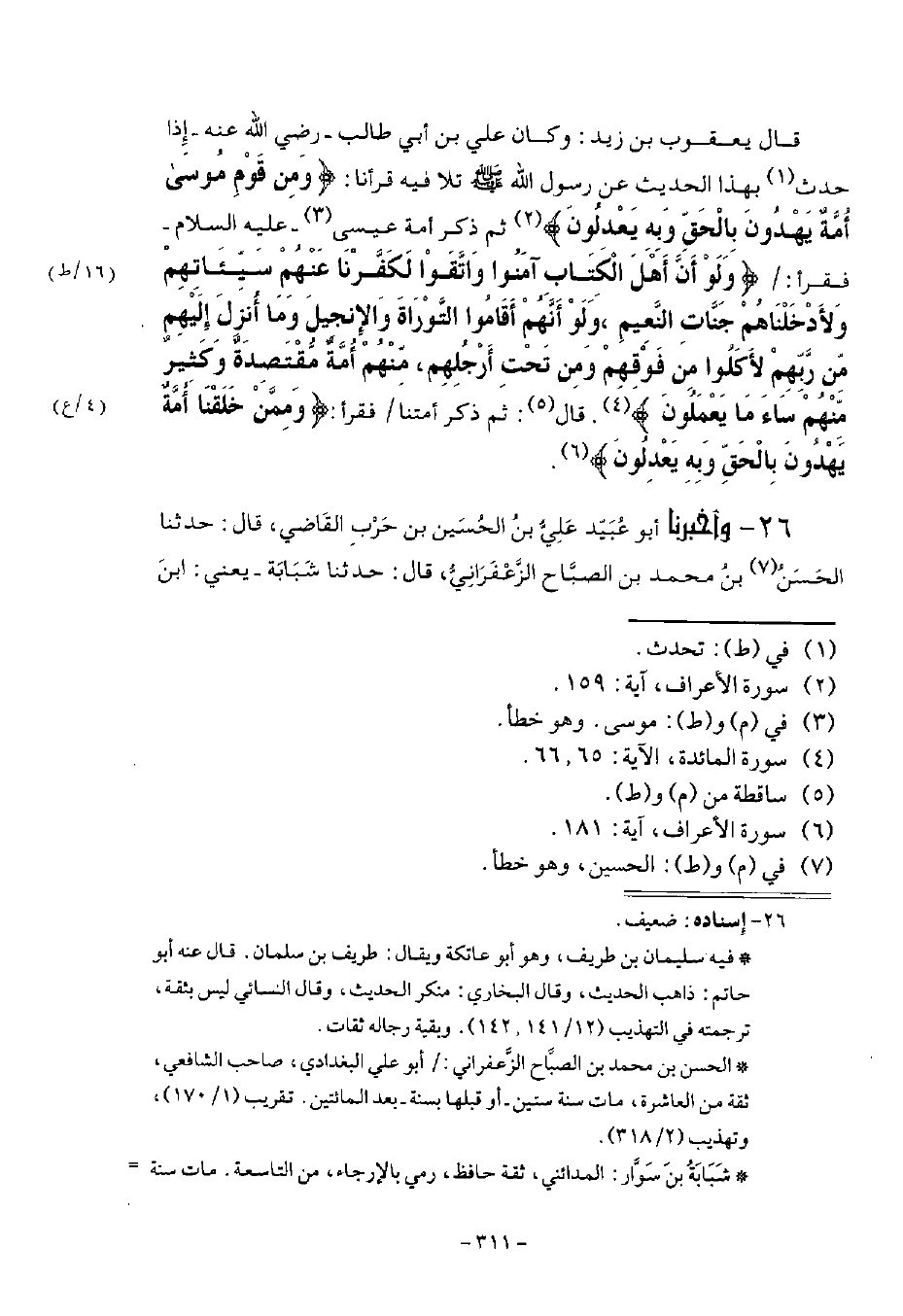 26 - وَأَخْبَرَنَا أَبُو عُبَيْدٍ عَلِيُّ بْنُ الْحُسَيْنِ بْنِ حَرْبٍ الْقَاضِي قَالَ: حَدَّثَنَا الْحَسَنُ بْنُ مُحَمَّدِ بْنِ الصَّبَّاحِ الزَّعْفَرَانِيُّ قَالَ: حَدَّثَنَا شَبَابَةُ يَعْنِي ابْنَ -[312]- سَوَّارٍ قَالَ: أَخْبَرَنَا سُلَيْمَانُ بْنُ طَرِيفٍ، عَنْ أَنَسِ بْنِ مَالِكٍ قَالَ: قَالَ رَسُولُ اللَّهِ صَلَّى اللهُ عَلَيْهِ وَسَلَّمَ: «يَا ابْنَ سَلَّامٍ، عَلَى كَمْ تَفَرَّقَتْ بَنُو إِسْرَائِيلَ؟» قَالَ: عَلَى وَاحِدَةٍ وَسَبْعِينَ أَوِ اثْنَتَيْنِ وَسَبْعِينَ فِرْقَةً، كُلُّهُمْ يَشْهَدُ عَلَى بَعْضٍ بِالضَّلَالةِ، قَالُوا: أَفَلَا تُخْبِرُنَا لَوْ قَدْ خَرَجْتَ مِنَ الدُّنْيَا فَتَفَرَّقَ أُمَّتُكَ، عَلَى مَا يَصِيرُ أَمْرُهُمْ؟ قَالَ نَبِيُّ اللَّهِ صَلَّى اللهُ عَلَيْهِ وَسَلَّمَ: «بَلَى، إِنَّ §بَنِي إِسْرَائِيلَ تَفَرَّقُوا عَلَى مَا قُلْتَ وَسَتَفْتَرِقُ أُمَّتِي عَلَى مَا افْتَرَقَتْ عَلَيْهِ بَنُو إِسْرَائِيلَ، وَسَتَزِيدُ فِرْقَةٌ وَاحِدَةٌ لَمْ تَكُنْ فِي بَنِي إِسْرَائِيلَ» وَذَكَرَ الْحَدِيثَ