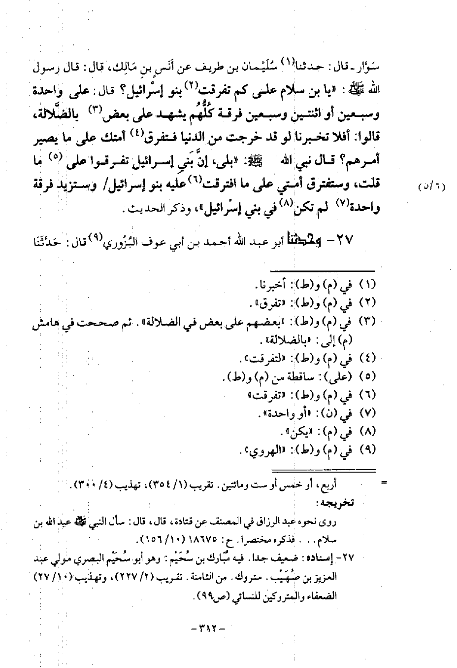 27 - وَحَدَّثَنَا أَبُو عَبْدِ اللَّهِ أَحْمَدُ بْنُ أَبِي عَوْفٍ الْبَزْوَرِيُّ قَالَ: حَدَّثَنَا -[313]- سُوَيْدُ بْنُ سَعِيدٍ قَالَ: حَدَّثَنَا مُبَارَكُ بْنُ سُحَيْمٍ، عَنْ عَبْدِ الْعَزِيزِ بْنِ صُهَيْبٍ، عَنْ أَنَسٍ عَنِ النَّبِيِّ صَلَّى اللهُ عَلَيْهِ وَسَلَّمَ قَالَ: «§افْتَرَقَتْ بَنُو إِسْرَائِيلَ عَلَى إِحْدَى وَسَبْعِينَ فِرْقَةً، وَإِنَّ أُمَّتِي سَتَفْتَرِقُ عَلَى ثَلَاثٍ وَسَبْعِينَ فِرْقَةً، كُلُّهَا فِي النَّارِ إِلَّا السَّوَادَ الْأَعْظَمَ»
