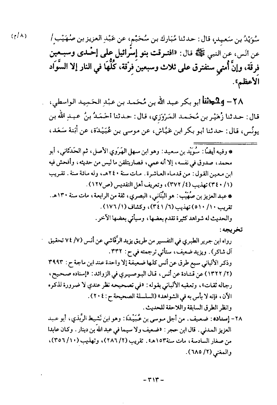 28 - وَحَدَّثَنَا أَبُو بَكْرٍ عَبْدُ اللَّهِ بْنُ مُحَمَّدِ بْنِ عَبْدِ الْحَمِيدِ الْوَاسِطِيُّ قَالَ: حَدَّثَنَا زُهَيْرُ بْنُ مُحَمَّدٍ الْمَرْوَزِيُّ قَالَ: نا أَحْمَدُ بْنُ عَبْدِ اللَّهِ بْنِ يُونُسَ قَالَ: نا أَبُو بَكْرِ بْنُ عَيَّاشٍ، عَنْ مُوسَى بْنِ عُبَيْدَةَ، عَنِ ابْنَةِ سَعْدٍ , -[314]- عَنْ أَبِيهَا سَعْدٍ رَضِيَ اللَّهُ عَنْهُ قَالَ: قَالَ رَسُولُ اللَّهِ صَلَّى اللهُ عَلَيْهِ وَسَلَّمَ: " §افْتَرَقَتْ بَنُو إِسْرَائِيلَ عَلَى إِحْدَى وَسَبْعِينَ مِلَّةً، وَلَنْ تَذْهَبَ الْأَيَّامُ وَاللَّيَالِي حَتَّى تَفْتَرِقَ أُمَّتِي عَلَى مِثْلِهَا أَوْ قَالَ: عَنْ مِثْلِ ذَلِكَ , وَكُلُّ فِرْقَةٍ مِنْهَا فِي النَّارِ إِلَّا وَاحِدَةً وَهِيَ الْجَمَاعَةُ "