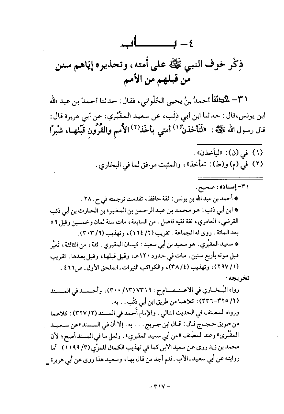 31 - حَدَّثَنَا أَحْمَدُ بْنُ يَحْيَى الْحُلْوَانِيُّ قَالَ: حَدَّثَنَا أَحْمَدُ بْنُ عَبْدِ اللَّهِ بْنِ يُونُسَ قَالَ: حَدَّثَنَا ابْنُ أَبِي ذِئْبٍ، عَنْ سَعِيدٍ الْمَقْبُرِيِّ، عَنْ أَبِي هُرَيْرَةَ قَالَ: قَالَ رَسُولُ اللَّهِ صَلَّى اللهُ عَلَيْهِ وَسَلَّمَ: «§لَيَأْخُذَنَّ أُمَّتِي بِأَخْذِ الْأُمَمِ وَالْقُرُونِ قَبْلَهَا شِبْرًا بِشِبْرٍ، وَذِرَاعًا بِذِرَاعٍ» قِيلَ: يَا رَسُولَ اللَّهِ، كَمَا فَعَلَتْ فَارِسُ وَالرُّومُ؟ قَالَ رَسُولُ اللَّهِ صَلَّى اللهُ عَلَيْهِ وَسَلَّمَ: «وَمَنِ النَّاسُ إِلَّا أُولَئِكَ؟»