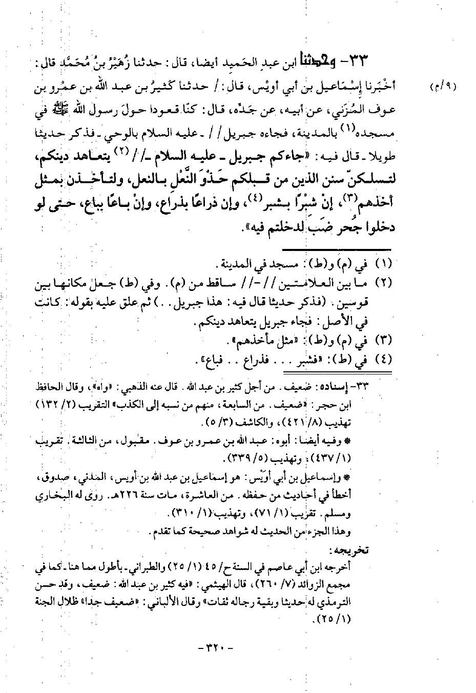 33 - وَحَدَّثَنَا ابْنُ عَبْدِ الْحَمِيدِ أَيْضًا قَالَ: حَدَّثَنَا زُهَيْرُ بْنُ مُحَمَّدٍ قَالَ: أنا إِسْمَاعِيلُ بْنُ أَبِي أُوَيْسٍ قَالَ: حَدَّثَنَا كَثِيرُ بْنُ عَبْدِ اللَّهِ بْنِ عَمْرِو بْنِ عَوْفٍ الْمُزَنِيُّ، عَنْ أَبِيهِ، عَنْ جَدِّهِ قَالَ: كُنَّا قُعُودًا حَوْلَ رَسُولِ اللَّهِ صَلَّى اللهُ عَلَيْهِ وَسَلَّمَ فِي مَسْجِدِهِ بِالْمَدِينَةِ، فَجَاءَهُ جِبْرِيلُ عَلَيْهِ السَّلَامُ بِالْوَحْيِ , فَذَكَرَ حَدِيثًا طَوِيلًا قَالَ فِيهِ: جَاءَكُمْ جِبْرِيلُ عَلَيْهِ السَّلَامُ يَتَعَاهَدُ دِينَكُمْ «§لَتَسْلُكُنَّ سُنَنَ الَّذِينَ مِنْ قَبْلِكُمْ حَذْوَ النَّعْلِ بِالنَّعْلِ وَلَتَأْخُذُنَّ بِمِثْلِ أَخَذْهِمْ، إِنْ شِبْرًا بِشِبْرٍ، وَإِنْ ذِرَاعًا بِذِرَاعٍ، وَإِنْ بَاعًا بِبَاعٍ، حَتَّى لَوْ دَخَلُوا جُحْرَ ضَبٍّ لَدَخَلْتُمْ فِيهِ»