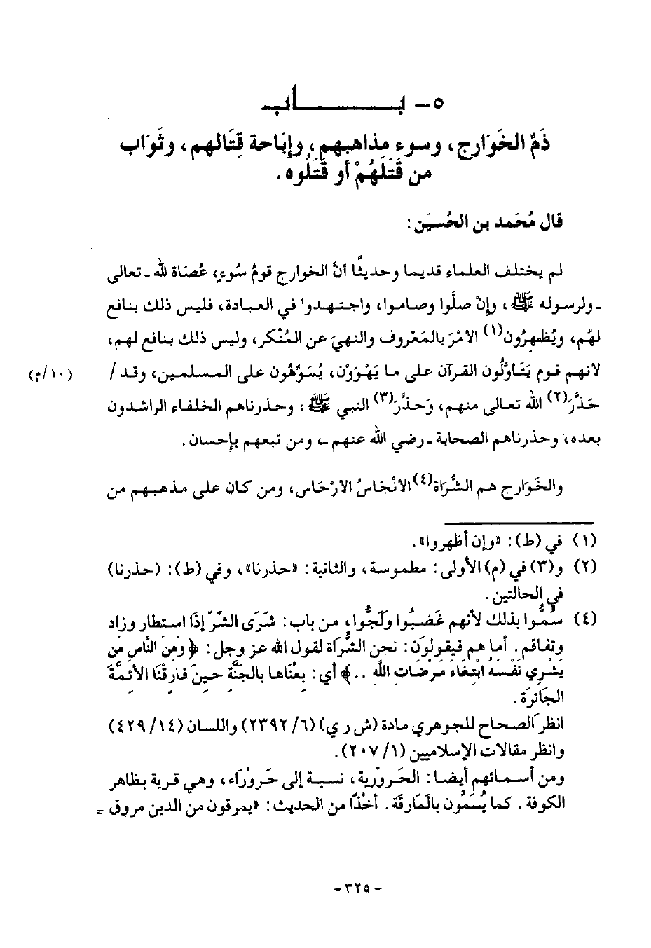 §بَابُ ذَمِّ الْخَوَارِجِ وَسُوءِ مَذَاهِبِهِمْ , وَإِبَاحَةِ قِتَالِهِمْ وَثَوَابِ مَنْ قَتَلَهُمْ أَوْ قَتَلُوهُ قَالَ مُحَمَّدُ بْنُ الْحُسَيْنِ: لَمْ يَخْتَلِفِ الْعُلَمَاءُ قَدِيمًا وَحَدِيثًا أَنَّ الْخَوَارِجَ قَوْمُ سُوءٍ عُصَاةٌ لِلَّهِ تَعَالَى وَلِرَسُولِهِ صَلَّى اللهُ عَلَيْهِ وَسَلَّمَ، وَإِنْ صَلَّوْا وَصَامُوا، وَاجْتَهَدُوا فِي الْعِبَادَةِ، فَلَيْسَ ذَلِكَ بِنَافِعٍ لَهُمْ، نَعَمْ , وَيُظْهِرُونَ الْأَمْرَ بِالْمَعْرُوفِ وَالنَّهْيِ عَنِ الْمُنْكَرِ، وَلَيْسَ ذَلِكَ بِنَافِعٍ لَهُمْ؛ لِأَنَّهُمْ قَوْمٌ يَتَأَوَّلُونَ الْقُرْآنَ عَلَى مَا يَهْوُونَ، وَيُمَوِّهُونَ عَلَى الْمُسْلِمِينَ، وَقَدْ حَذَّرَنَا اللَّهُ تَعَالَى مِنْهُمْ، وَحَذَّرَنَا النَّبِيُّ صَلَّى اللهُ عَلَيْهِ وَسَلَّمَ، وَحَذَّرَنَاهُمُ الْخُلَفَاءُ الرَّاشِدُونَ بَعْدَهُ، وَحَذَّرَنَاهُمُ الصَّحَابَةُ رَضِيَ اللَّهُ عَنْهُمْ وَمَنْ تَبِعَهُمْ بِإِحْسَانٍ، وَالْخَوَارِجُ هُمُ الشُّرَاةُ الْأَنْجَاسُ الْأَرْجَاسُ، وَمَنْ كَانَ عَلَى مَذْهَبِهِمْ مِنْ