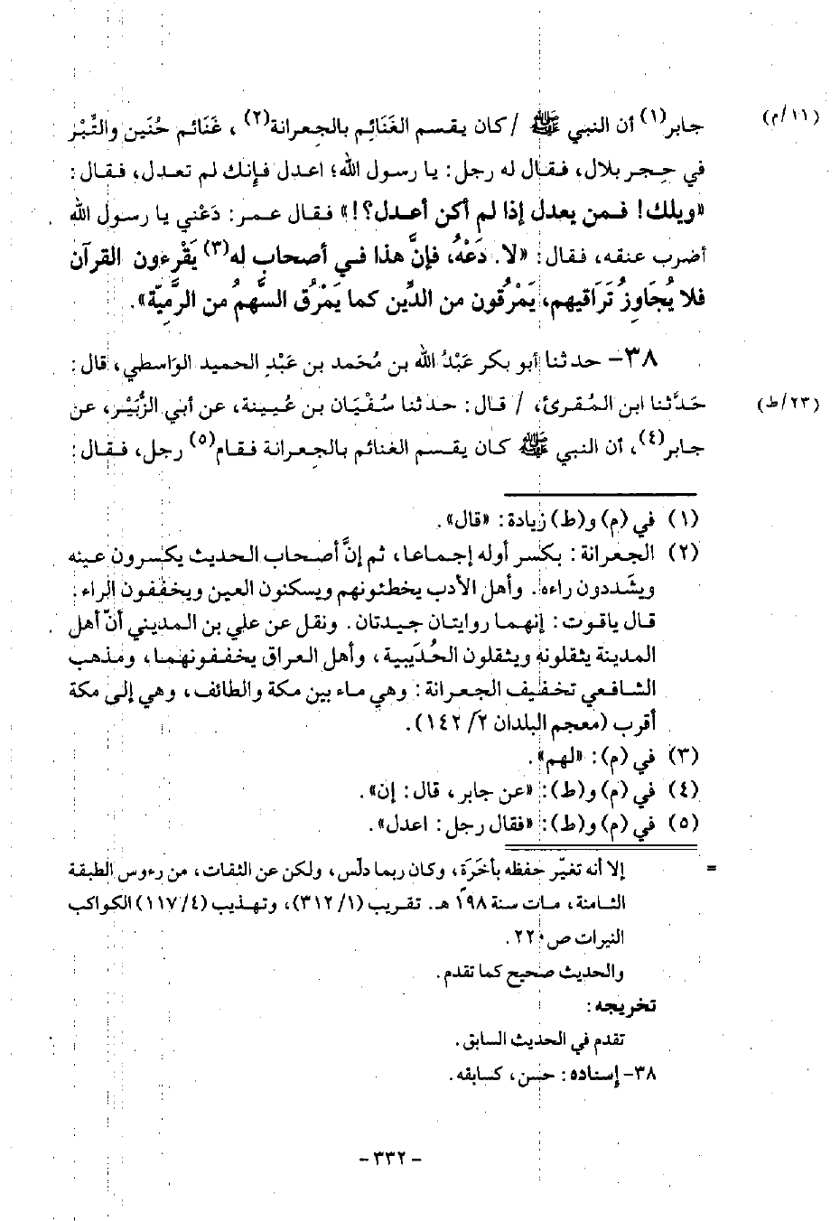 38 - حَدَّثَنَا أَبُو بَكْرٍ عَبْدُ اللَّهِ بْنِ مُحَمَّدِ بْنِ عَبْدِ الْحَمِيدِ الْوَاسِطِيُّ قَالَ: حَدَّثَنَا ابْنُ الْمُقْرِئِ قَالَ: حَدَّثَنَا سُفْيَانُ بْنُ عُيَيْنَةَ، عَنْ أَبِي الزُّبَيْرِ، عَنْ جَابِرٍ أَنَّ النَّبِيَّ صَلَّى اللهُ عَلَيْهِ وَسَلَّمَ كَانَ يَقْسِمُ الْغَنَائِمَ بِالْجِعْرَانَةِ، فَقَامَ رَجُلٌ فَقَالَ -[333]-: اعْدِلْ، فَإِنَّكَ لَمْ تَعْدِلْ فَقَالَ: " وَيْحَكَ: §فَمَنْ يَعْدِلُ إِذَا لَمْ أَكُنْ أَعْدِلُ؟ " فَقَالَ عُمَرُ رَضِيَ اللَّهُ عَنْهُ: دَعْنِي أَضْرِبُ عُنُقَ هَذَا الْمُنَافِقِ، فَقَالَ: «دَعْهُ فَإِنَّ هَذَا أَصْحَابٌ لَهُ - أَوْ فِي أَصْحَابٍ لَهُ - يَقْرَءُونَ الْقُرْآنَ لَا يُجَاوِزُ تَرَاقِيَهُمْ، يَمْرُقُونَ مِنَ الدِّينِ كَمَا يَمْرُقُ السَّهْمُ مِنَ الرَّمِيَّةِ»