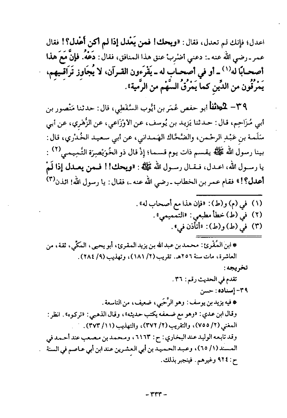 39 - حَدَّثَنَا أَبُو حَفْصٍ عُمَرُ بْنُ أَيُّوبَ السَّقَطِيُّ قَالَ: حَدَّثَنَا مَنْصُورُ بْنُ أَبِي مُزَاحِمٍ قَالَ: حَدَّثَنَا يَزِيدُ بْنُ يُوسُفَ، عَنِ الْأَوْزَاعِيِّ، عَنِ الزُّهْرِيِّ، عَنْ أَبِي سَلَمَةَ بْنِ عَبْدِ الرَّحْمَنِ، وَالضَّحَّاكِ الْهَمْدَانِيِّ، عَنْ أَبِي سَعِيدٍ الْخُدْرِيِّ قَالَ: بَيْنَا رَسُولُ اللَّهِ صَلَّى اللهُ عَلَيْهِ وَسَلَّمَ يَقْسِمُ ذَاتَ يَوْمٍ قَسْمًا إِذْ قَالَ ذُو الْخُوَيْصِرَةِ التَّمِيمِيُّ: يَا رَسُولَ اللَّهِ اعْدِلْ فَقَالَ رَسُولُ اللَّهِ صَلَّى اللهُ عَلَيْهِ وَسَلَّمَ: " وَيْحَكَ: §فَمَنْ يَعْدِلُ إِذَا لَمْ أَكُنْ أَعْدِلُ " فَقَامَ عُمَرُ بْنُ الْخَطَّابِ رَضِيَ اللَّهُ عَنْهُ فَقَالَ: يَا رَسُولَ اللَّهِ، أَتَأْذَنُ -[334]- لِي أَضْرِبُ عُنُقَهُ؟ قَالَ: «لَا، إِنَّ لَهُ أَصْحَابًا يَحْقِرُ أَحَدُكُمْ صَلَاتَهُ مَعَ صَلَاتِهِ، وَصِيَامَهُ مَعَ صِيَامِهِ، يَمْرُقُونَ مِنَ الدِّينِ كَمَا يَمْرُقُ السَّهْمُ مِنَ الرَّمِيَّةِ، يَنْظُرُ إِلَى نَصْلِهِ فَلَا يُوجَدُ فِيهِ شَيْءٌ، ثُمَّ يَنْظُرُ إِلَى رَصَافِهِ -[335]- فَلَا يُوجَدُ فِيهِ شَيْءٌ، ثُمَّ يَنْظُرُ إِلَى نَضِيِّهِ فَلَا يُوجَدْ فِيهِ شَيْءٌ، ثُمَّ يَنْظُرُ إِلَى قُذُذِهِ فَلَا يُوجَدْ فِيهِ شَيْءٌ، سَبَقَ الْفَرْثَ وَالدَّمَ، يَخْرُجُونَ عَلَى حِينٍ فُرْقَةٍ مِنَ النَّاسِ، آيَتُهُمْ رَجُلٌ أَدْعَجُ إِحْدَى يَدَيْهِ مِثْلُ ثَدْيِ الْمَرْأَةِ، أَوْ مِثْلُ الْبَضْعَةِ، تَدَرْدَرُ» قَالَ أَبُو سَعِيدٍ: أَشْهَدُ: لَسَمِعْتُ هَذَا مِنْ رَسُولِ اللَّهِ صَلَّى اللهُ عَلَيْهِ وَسَلَّمَ -[336]- وَأَشْهَدُ أَنِّي كُنْتُ مَعَ عَلِيِّ بْنِ أَبِي طَالِبٍ رَضِيَ اللَّهُ عَنْهُ حِينَ قَتَلَهُمْ وَالْتَمَسَ فِي الْقَتْلَى، فَأَتَى بِهِ عَلَى النَّعْتِ الَّذِي نَعَتَ رَسُولُ اللَّهِ صَلَّى اللهُ عَلَيْهِ وَسَلَّمَ
